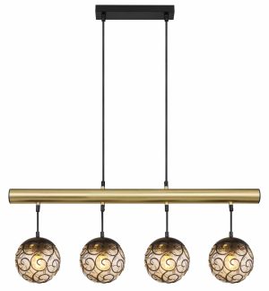 Cette magnifique suspension de la série FITZ s’inspire d’un design exceptionnel. D’un montage de plafond rectangulaire, deux câbles descendent vers une barre centrale dorée de 90 cm de long, sur laquelle se trouvent quatre connexions E27 pour ampoules LED, chacune avec un abat-jour décoratif bien formé. Grâce aux connexions E27, vous pouvez choisir vous-même la couleur et la luminosité de la lumière jusqu’à une puissance maximale de 9 watts. En raison de leur longue durée de vie et de leur économie d’énergie, nous recommandons des ampoules LED.