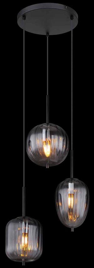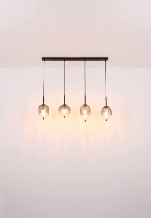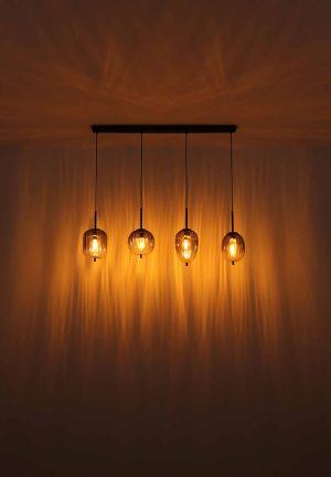Cette suspension, d’un diamètre de 460 mm et d’une hauteur de 1200 mm, est fabriquée en métal noir mat et en verre fumé. Le diamètre du verre varie de 15,8 cm à 18,5 cm. Idéale pour un look moderne, cette lampe offre une atmosphère chaleureuse dans chaque pièce.