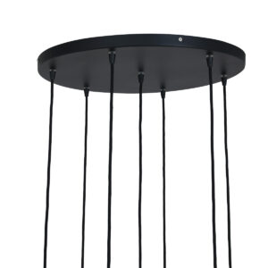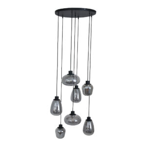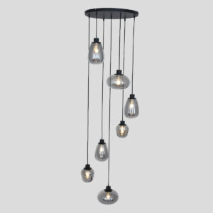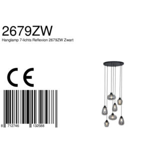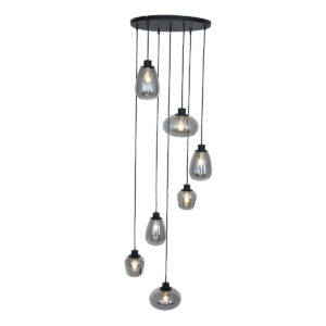 Une sensation directe de luxe et de glamour discret lorsque vous entrez. Cela est assuré par cette lampe à suspension Reflexion avec sept câbles extra longs fixés à un plafonnier rond noir. À cela, pendent sept lampes en verre fumé réfléchissant de différentes formes et à des hauteurs inégales. Celles-ci créent un jeu de lumière magique avec des sources lumineuses à filament. Une déclaration à couper le souffle pour votre hall, votre vide ou tout plafond haut !