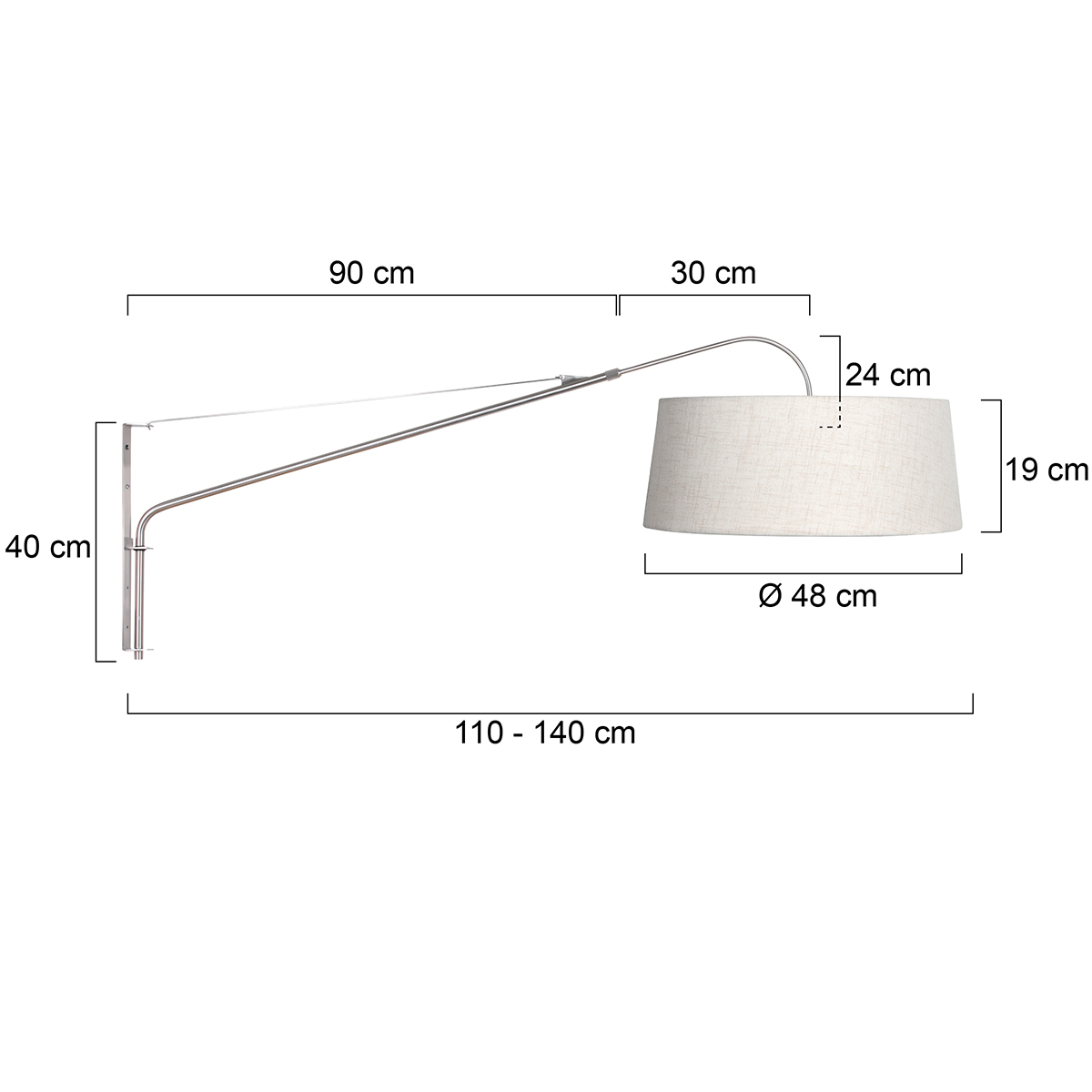 L’abat-jour en lin couleur crème, avec un diamètre de 48 centimètres en bas, 44 centimètres en haut et une hauteur de 19 centimètres, constitue un doux contraste avec l’acier froid. L’intérieur blanc permet une réflexion lumineuse claire et un éclairage uniforme de l’espace. Ensemble, cet ensemble crée une disposition murale élégante qui s’intègre parfaitement dans des intérieurs à la fois rustiques et modernes.