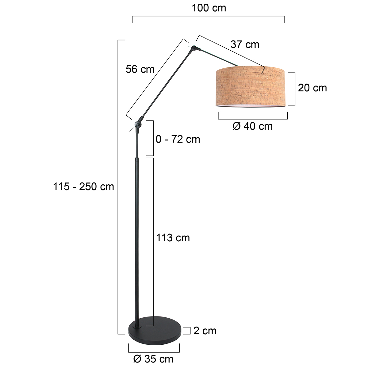 Cette grande lampe arc noire de la série Prestige Chic est dotée d’un abat-jour rond en liège de 40 centimètres de large et 20 centimètres de haut. La fine structure noire est réglable, ce qui vous permet de diriger la lumière facilement vers l’endroit souhaité. Le support E27 inclinable garantit que l’abat-jour est toujours droit, et le cordon de 220 centimètres avec interrupteur au pied facilite encore plus l’utilisation.