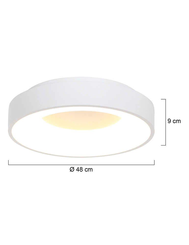 Le plafonnier blanc de la série Ringlede a une apparence moderne et élégante. Avec un diamètre de 48 cm, ce luminaire offre un effet lumineux spacieux. Le module LED intégré de 40 watts fournit une luminosité allant jusqu’à 3600 lumens et une couleur de lumière chaude de 2700 Kelvin. Le luminaire est facilement dimmable avec un variateur externe (non inclus), vous permettant d’adapter complètement l’ambiance de votre maison à vos souhaits.