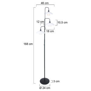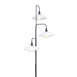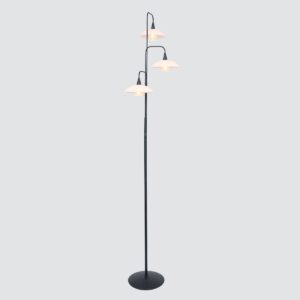 C’est comme une longue tige de fleur abstraite, cette lampe sur pied Tallerken au style vintage moderne. En haut, la tige en métal noir avec variateur de luminosité s’incline vers trois abat-jours en forme de soucoupe. Ceux-ci sont en verre opale et diffusent une lumière douce. En bas des soucoupes, vous voyez une extension en verre de la douille métallique conique, comme un bouton de fleur. Votre coin salon ou lecture s’illumine immédiatement !