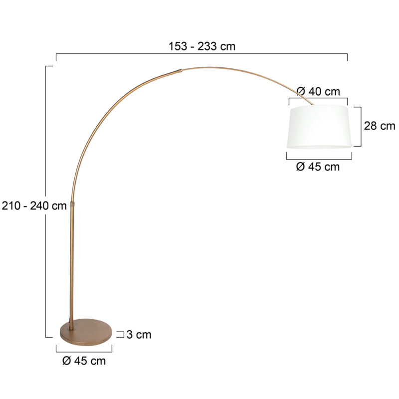 Cette lampe de sol en bronze combine un design élégant avec un confort pratique. Grâce à la douille E27 inclinable, l’abat-jour reste toujours droit, quelle que soit la position de l’arc – idéal pour une apparence épurée et soignée. La base solide de 45 cm et la hauteur réglable de 210 à 240 cm rendent cette lampe adaptée à divers espaces tels que le salon, la salle à manger ou le coin lecture.