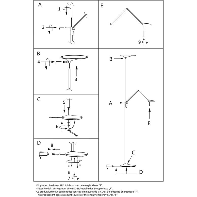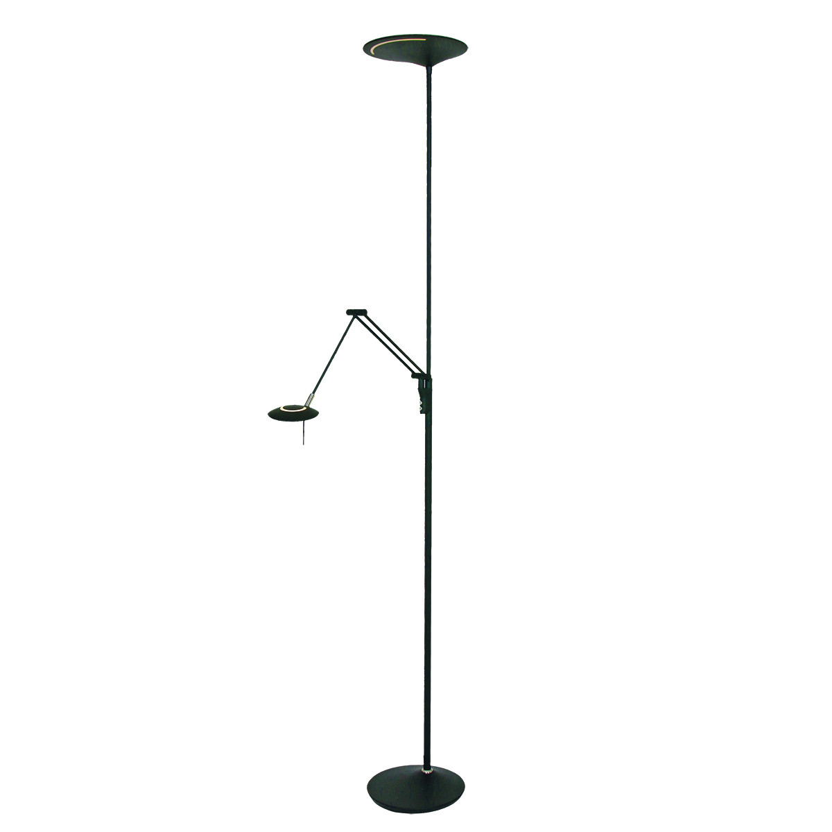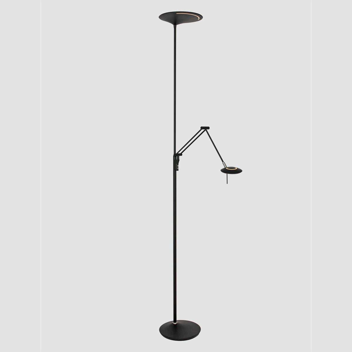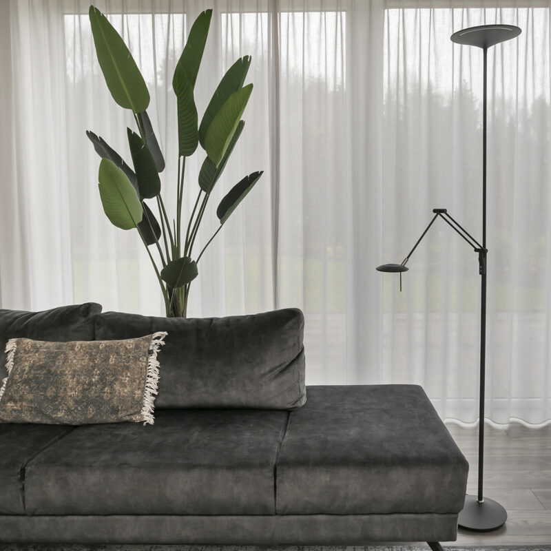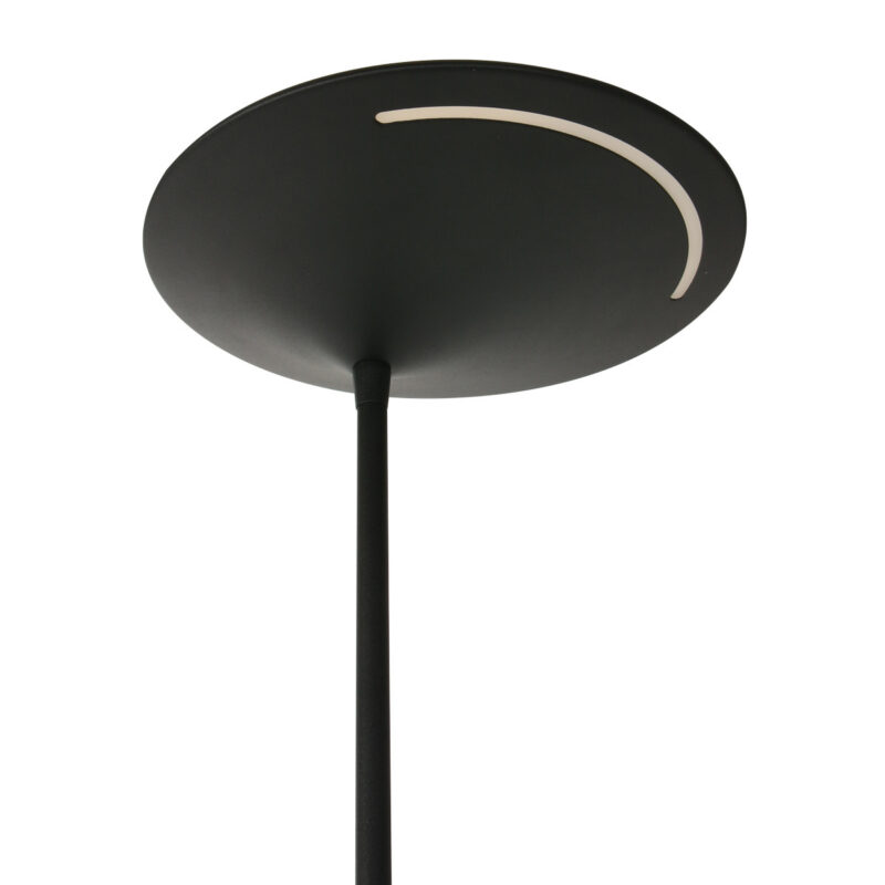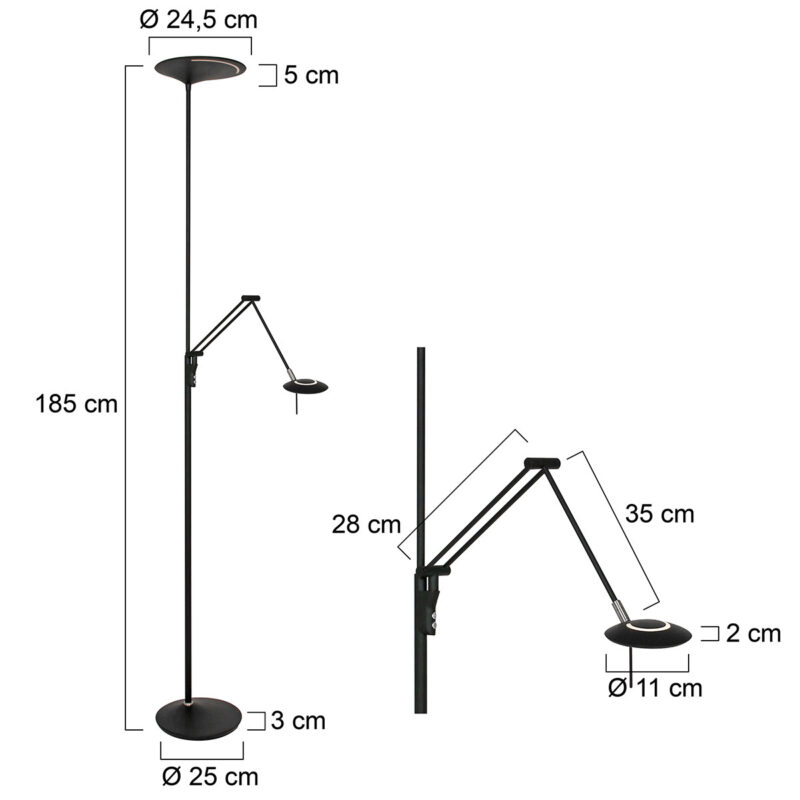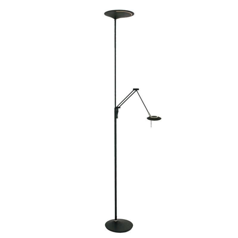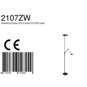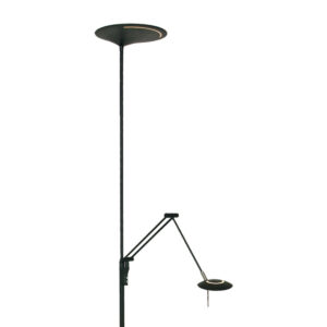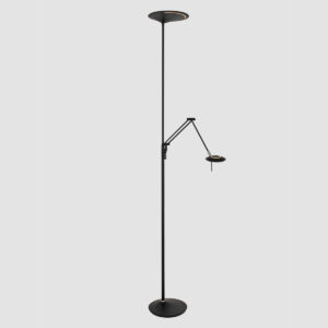 Ce lampadaire noir de la série Zodiac dispose d’un uplighter et d’une lampe de lecture, tous deux équipés de modules LED remplaçables. La lampe de lecture a un module LED de 6 watts (2700 Kelvin, 700 lumens) et l’uplighter a un puissant module LED de 25 watts (2700 Kelvin). Avec le variateur à bouton-poussoir sur le pied, vous pouvez régler séparément les deux sources lumineuses sur l’intensité lumineuse souhaitée. La lampe mesure 185 cm de hauteur et a une base stable d’un diamètre de 25 cm.