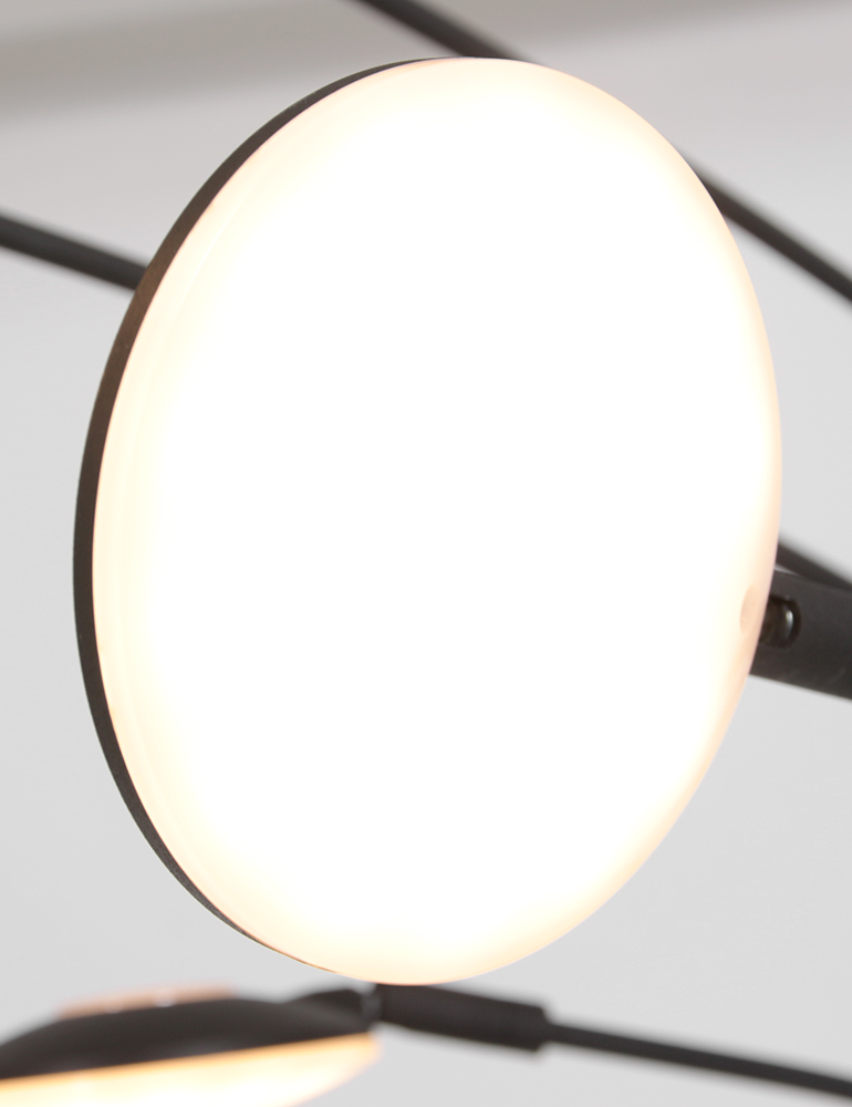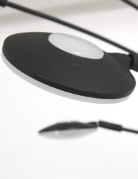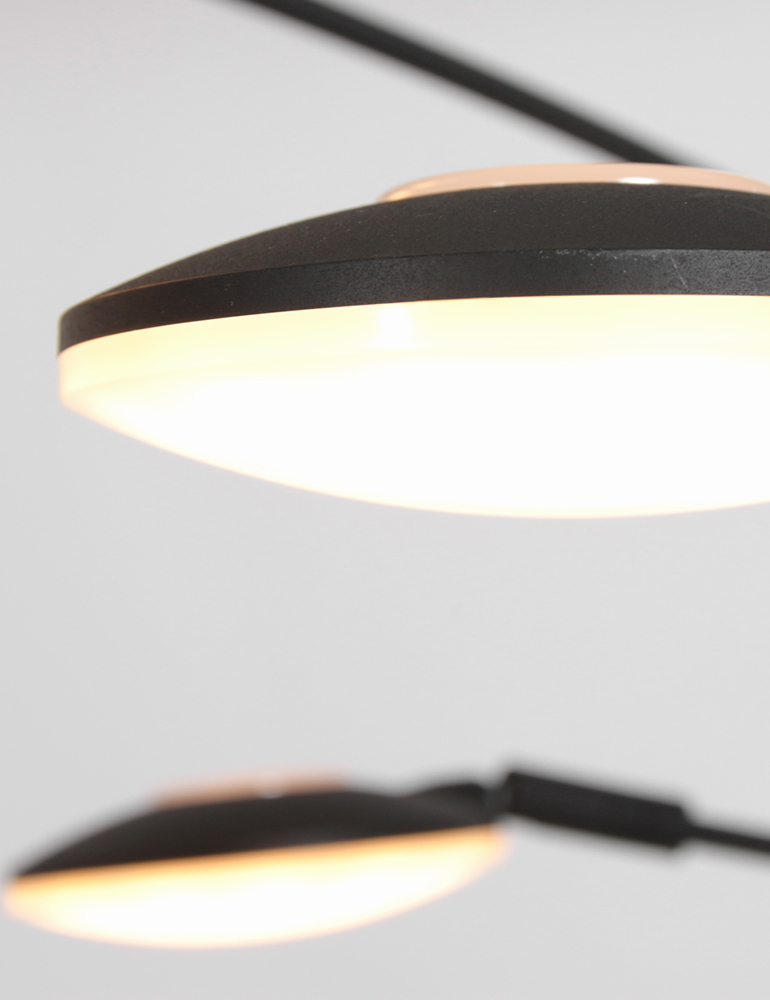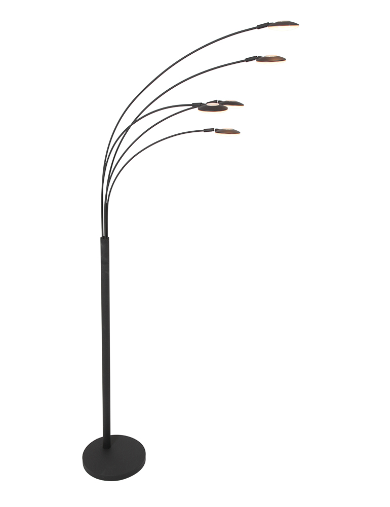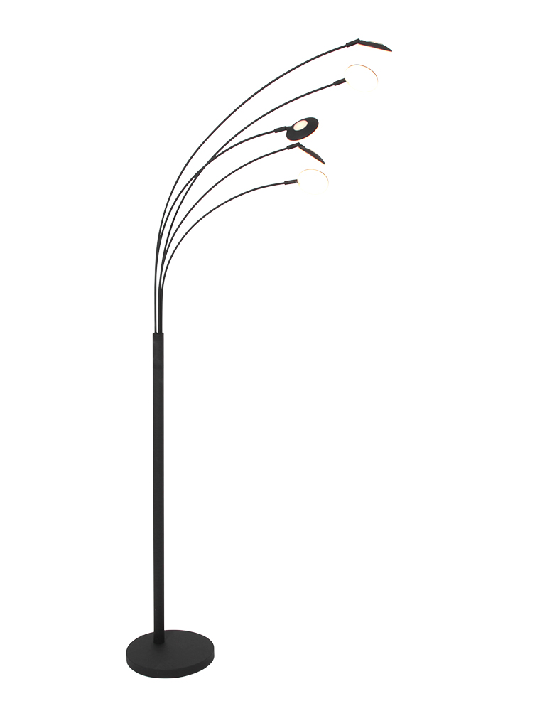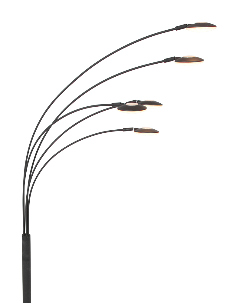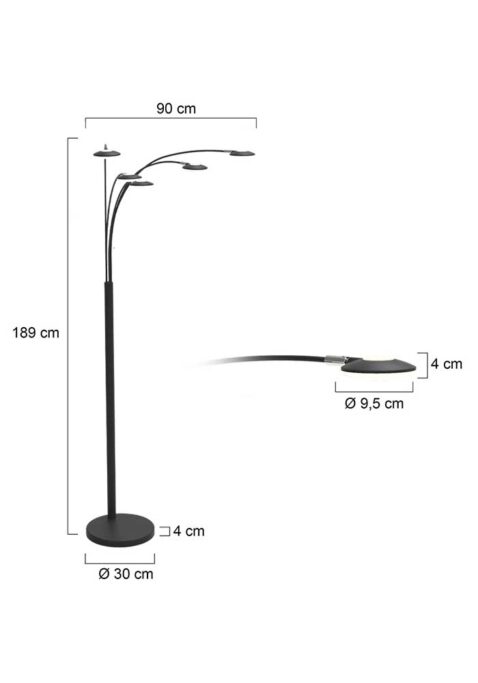 Cette lampe de sol noire à 5 lumières de la série Synna présente un design épuré et moderne. La lampe arc en métal a une hauteur totale de 189 cm et une profondeur de 90 cm. Les abat-jour d’un diamètre de 9,5 cm sont équipés de sources lumineuses LED intégrées de 4,5 watts, avec une température de couleur de 2700 Kelvin et un rendement lumineux de 500 lumens par abat-jour. Elle est dotée d’un variateur rotatif sur le pied et est livrée avec un cordon de 235 cm.