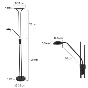 Le lampadaire noir de la série Biron a une apparence moderne et offre un éclairage flexible. Le design mince en métal noir mat s’intègre parfaitement dans divers intérieurs. L’abat-jour dispose d’un module LED fixe de 23 watts avec 2700 Kelvin et un flux lumineux de 2000 lumens, tandis que le bras de lecture réglable est équipé d’un module LED séparé de 8 watts. Grâce au variateur à double rotation, les deux sources lumineuses sont réglables séparément. Avec une hauteur de 180 cm et un cordon de 200 cm, cette lampe est un ajout élégant et fonctionnel à n’importe quel espace.