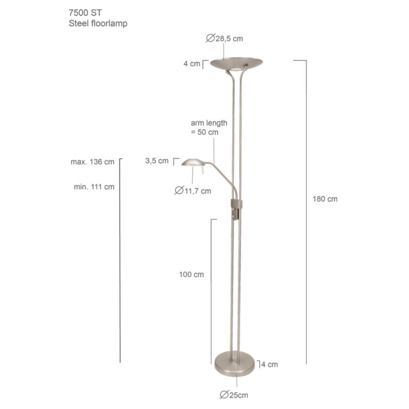 Une lampe sur pied qui, grâce à son bras de lecture, est un excellent choix pour la lecture, tout en créant une ambiance agréable grâce à la lumière indirecte. Cette lampe de lecture moderne Mexlite Jens est fabriquée en acier brossé et est équipée de 2 modules LED économes en énergie. Cette lampe de lecture dispose d’un uplighter et d’un bras de lecture, qui peuvent tous deux être dimmés indépendamment grâce aux deux variateurs rotatifs sur le luminaire.