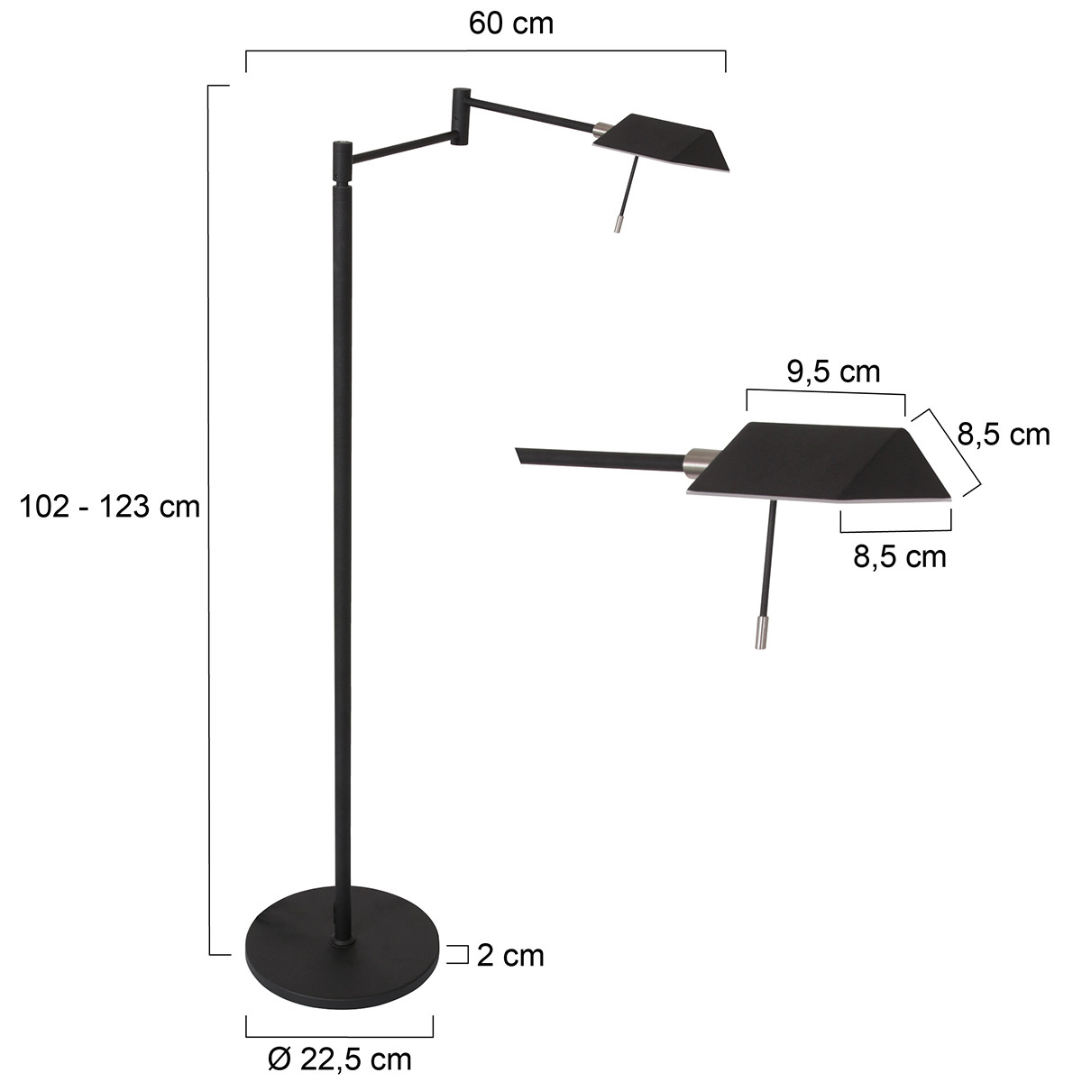 Le lampadaire Retina en noir offre une combinaison parfaite de style et d’utilisation pratique. La lampe est équipée d’un module LED remplaçable de 10 Watts avec un rendement lumineux de 1000 lumens et une fonction dim to warm qui permet de régler la couleur de la lumière entre 2200 et 4000 Kelvin. Le variateur à bouton-poussoir sur le tube permet un contrôle facile. La hauteur est réglable de 110 à 125 cm, avec un diamètre de base de 22,5 cm et un bras de lecture ayant une portée de 60 cm. Livré avec un cordon de 200 cm.