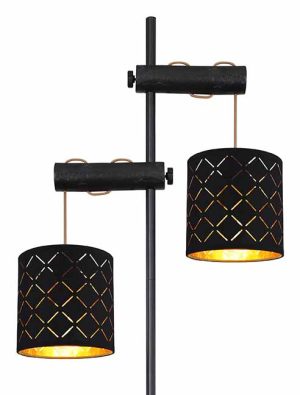Cette lampe sur pied de la série Clarke allie le noir et l’or pour un design élégant. Avec deux douilles E27 réglables sur des câbles dorés sur une tige métallique noire de 1,5 m de hauteur, elle offre une liberté de choix pour les sources lumineuses (max. 40W). Idéale pour le salon ou le bureau. Les ampoules LED sont recommandées.