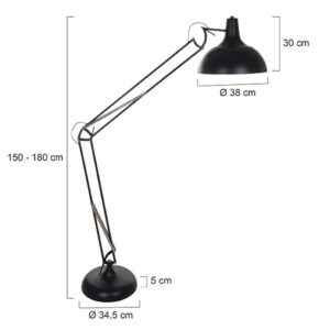Grande lampe de sol industrielle de la série Office Magna, une alternative impressionnante à la lampe arc classique. Cette lampe en métal noir mat est inclinable jusqu’à une hauteur maximale de 180 cm et possède une base solide pour la stabilité. L’abat-jour spacieux, d’un diamètre de 38 cm et d’une hauteur de 30 cm, est adapté aux sources lumineuses E27 jusqu’à 40 watts. Elle est livrée avec un cordon de 175 cm et un interrupteur marche/arrêt.