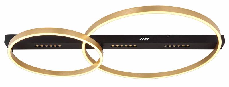 Découvrez la beauté d’un design raffiné avec ce plafonnier élégant. Cette élégance se manifeste dans un support noir mat de 93 centimètres sur lequel reposent deux panneaux LED circulaires en finition dorée, avec des diamètres de 39,5 centimètres et 58,5 centimètres. Ces panneaux émettent une lumière blanche chaude de 3000 Kelvin, créant une ambiance accueillante et confortable. Cette combinaison unique offre à la fois un design visuellement attrayant et une source de lumière pratique.