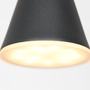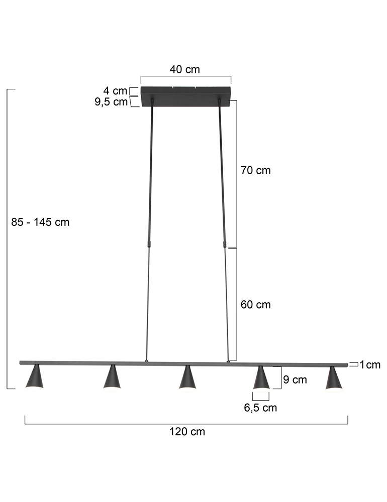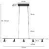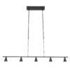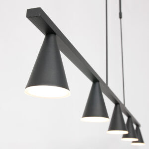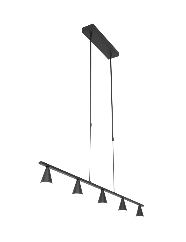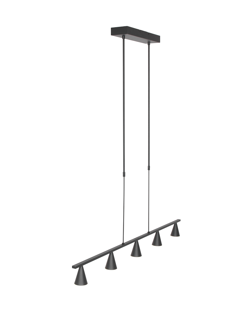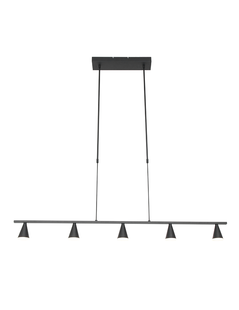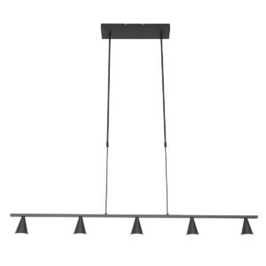 La lampe suspendue Vortex combine style et fonctionnalité. Ce design moderne avec cinq points lumineux en forme de cône est équipé de modules LED fixes de 5 Watts, avec une sortie lumineuse totale de 1100 lumens. La lampe propose des couleurs de lumière réglables entre 2700 et 4000 Kelvin, afin de créer facilement l’ambiance souhaitée. Le variateur tactile sur la lampe permet d’ajuster l’intensité lumineuse sans effort. La hauteur est réglable de 85 à 145 cm, et avec une longueur de 120 cm, cette lampe s’adapte parfaitement au-dessus de la table à manger.