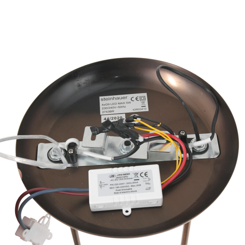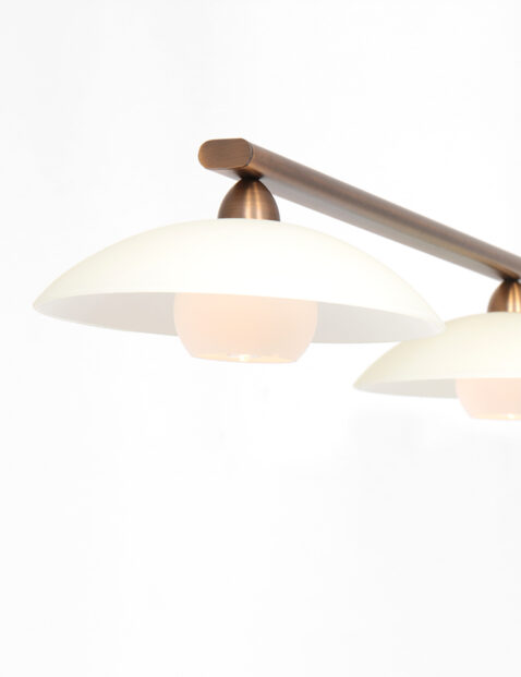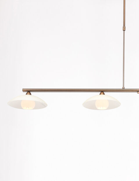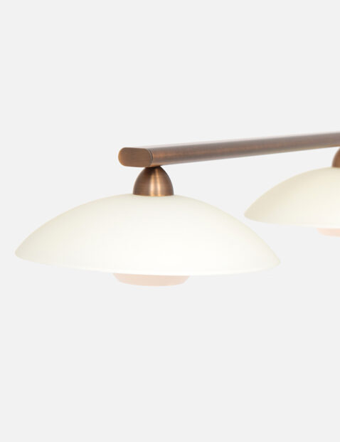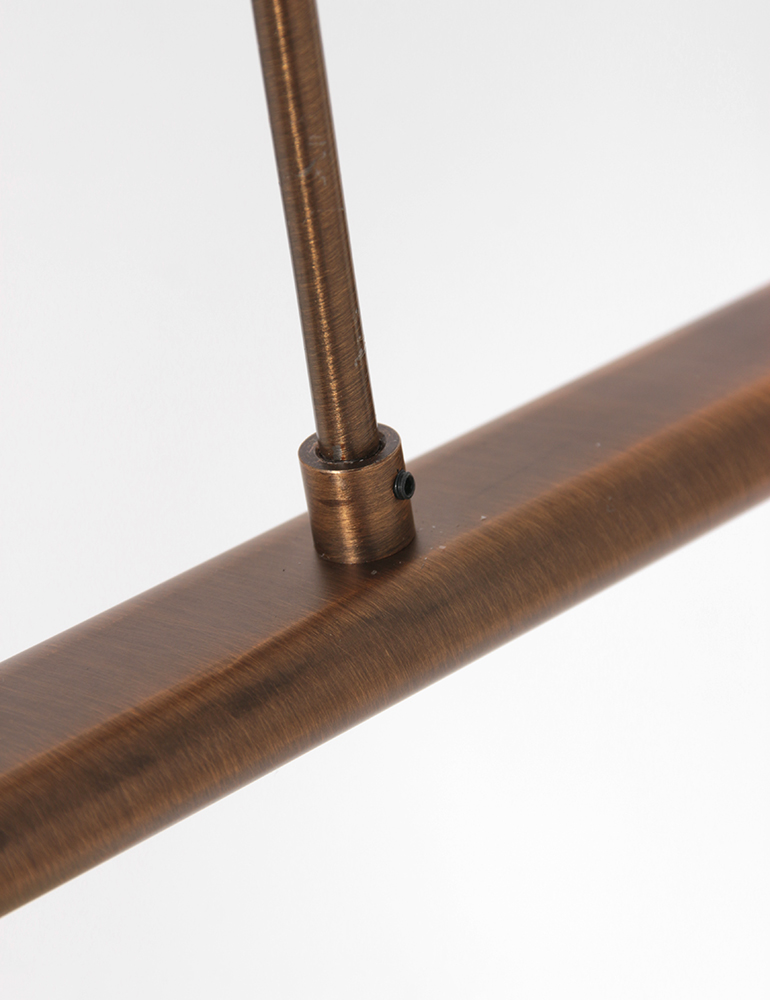 Facteur wow 100%. Vous cherchez une lampe imposante pour au-dessus de votre table à manger, alors cette “Sovereign Classic” de Steinhauer est faite pour vous. À partir d’une plaque de plafond, un tube horizontal pend à deux tiges. Quatre lampes en verre crème, laiteux, chacune avec sa propre belle source LED en dessous, sont suspendues à ce tube. Tout le métal est de couleur bronze. Parlez-nous dans un avis de la manière dont ce bijou s’intègre chez vous ?