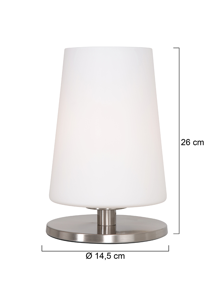 La lampe de table Ancilla en acier est un choix moderne et polyvalent pour tout intérieur. La lampe est dotée d’un abat-jour en verre opale blanc et est équipée d’une douille E27, compatible avec des sources lumineuses jusqu’à 40 Watts (non incluses). Grâce au contrôle tactile sur la base en métal, vous pouvez facilement allumer et éteindre la lampe. En combinaison avec une source lumineuse dimmable à 3 niveaux, l’intensité lumineuse est réglable. Livrée avec un cordon de 180 cm de long.