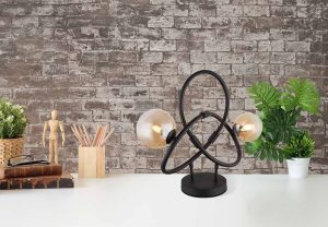 Lampe de table noire tournée 2 boules en verre d’ambre Globo Tuberius