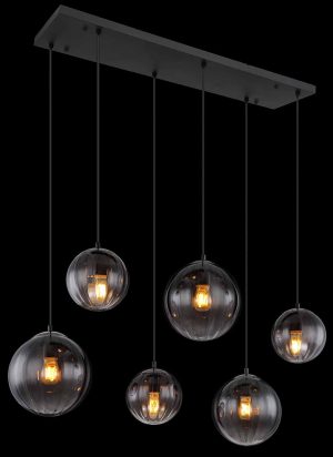 Ce plafonnier mesure 930 mm de long, 410 mm de large et 1200 mm de haut. Le métal noir mat et le verre fumé en font un élément d’éclairage élégant. Nécessite 6x E27 60W 230V ampoules (non incluses).