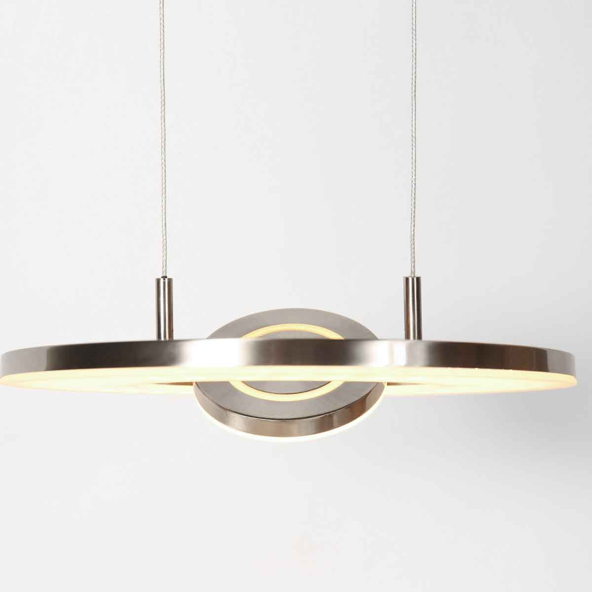 La suspension Soleil de Steinhauer Exclusive apporte une élégance moderne à votre intérieur avec un design en couleur acier épuré. Avec un diamètre de 32 cm et une finition métallique raffinée, cette lampe s’adapte parfaitement au-dessus d’une table à manger, d’un bureau ou d’un îlot de cuisine. L’élément circulaire rotatif innovant crée un effet lumineux ludique, permettant de générer à la fois de la lumière directe et indirecte. La puissance lumineuse de 4000 lumens combinée à la température de couleur chaude de 2700K fait de cette lampe un choix idéal pour divers espaces.