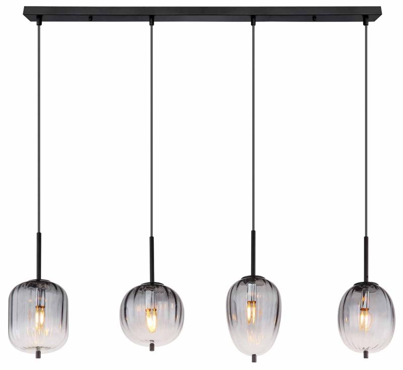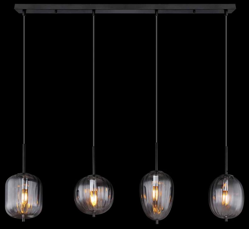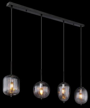 Ce luminaire suspendu, mesurant 1100 mm de long et 185 mm de large, est fabriqué en métal noir mat et en verre fumé. Le diamètre du verre varie de 15,8 cm à 18,5 cm. Un élément d’éclairage moderne et élégant qui crée une atmosphère agréable dans n’importe quelle pièce.