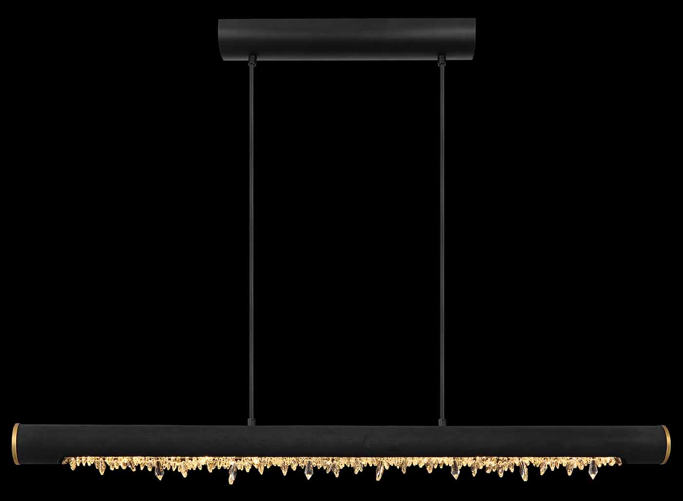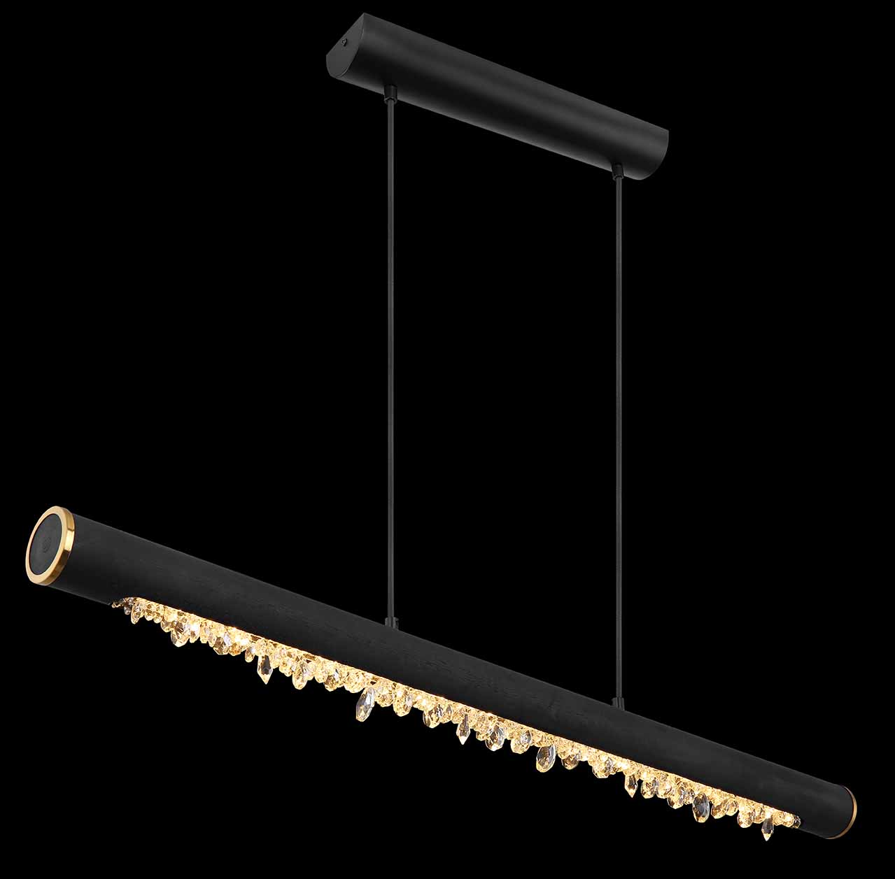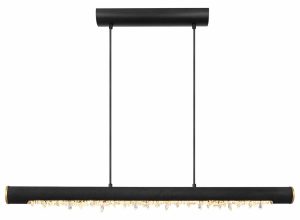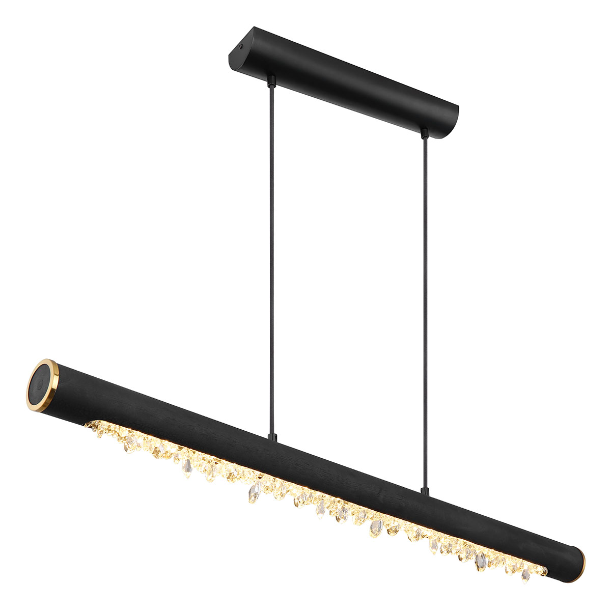 Avec ce luminaire suspendu de 100 cm de la série Felicitas, vous ajoutez une source de lumière élégante à votre intérieur. La barre en bois noir est suspendue par deux câbles noirs et possède des anneaux en laiton à chaque extrémité. De magnifiques cristaux acryliques recouvrent les lampes LED fournies qui émettent 980 lumens de lumière avec une chaude couleur de 3000 Kelvin. La hauteur peut être ajustée jusqu’à 150 cm lors de l’installation.