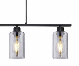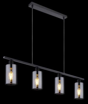 La lampe suspendue de la série Hadera, avec sa forme allongée et sa finition en métal noir mat, est idéale pour être installée au-dessus des tables à manger, offrant un éclairage uniforme. Cette lampe suspendue de 98 cm de long est équipée de quatre ampoules E27, chacune entourée de verre cylindrique fumé, et propose une couleur et une luminosité de lumière réglables individuellement.
