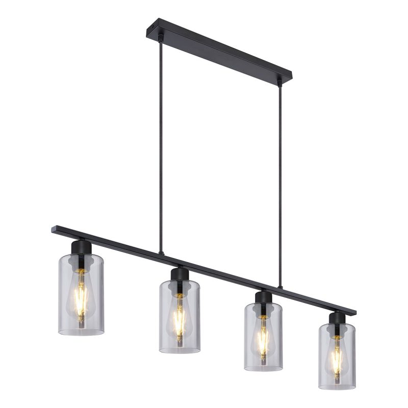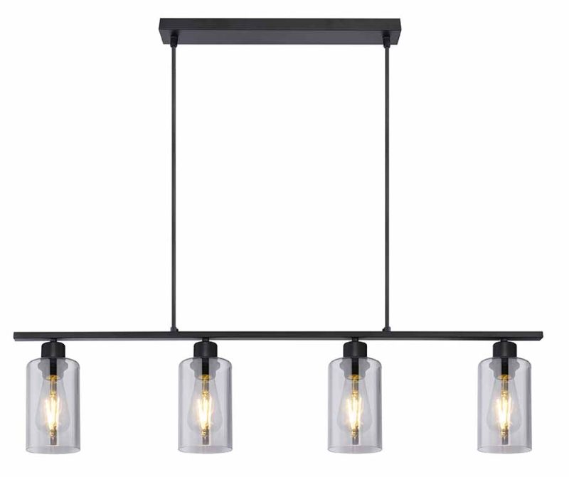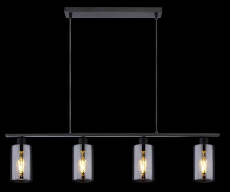 La lampe suspendue de la série Hadera, avec sa forme allongée et sa finition en métal noir mat, est idéale pour être installée au-dessus des tables à manger, offrant un éclairage uniforme. Cette lampe suspendue de 98 cm de long est équipée de quatre ampoules E27, chacune entourée de verre cylindrique fumé, et propose une couleur et une luminosité de lumière réglables individuellement.