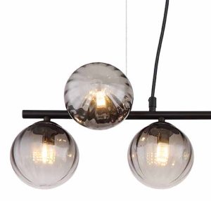 Ce luminaire suspendu a une longueur de 950 mm, une largeur de 280 mm et une hauteur de 1200 mm. Fabriqué en métal noir mat et en verre fumé, il offre un éclairage moderne et élégant. Nécessite 7x G9 LED 10W 230V ampoules (non incluses).