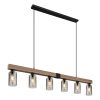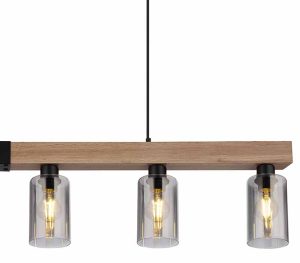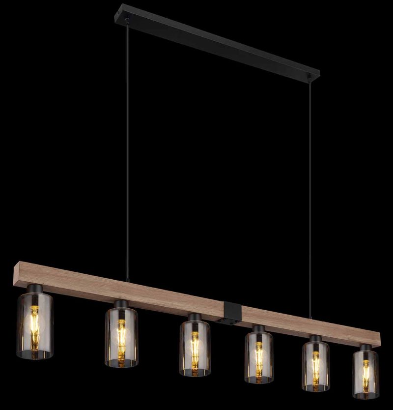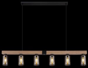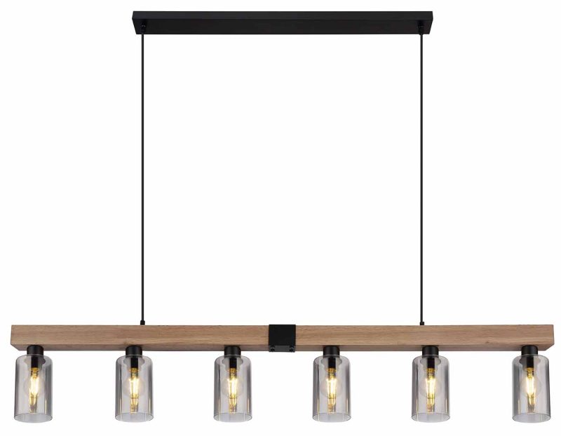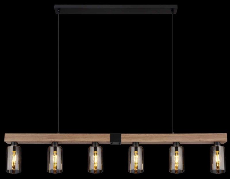 Embellissez votre intérieur avec ce luminaire suspendu moderne de la série HADERA. Celui-ci est suspendu par deux câbles à un montage de plafond rectangulaire et s’étend sur une poutre de 1,4 m de long en bois, équipée de six douilles E27, chacune recouverte d’un abat-jour en verre fumé. Des ampoules LED sont recommandées pour leur longue durée de vie et leur économie d’énergie.