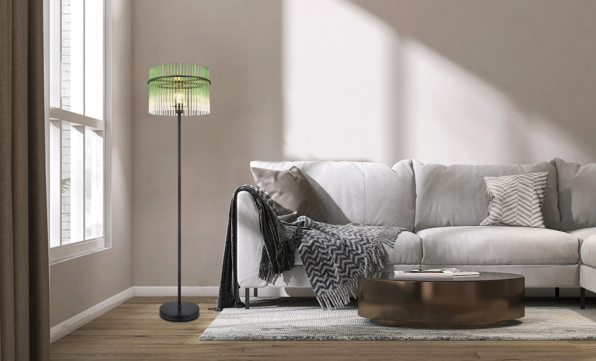 La lampe sur pied GORLEY allie modernité et élégance. Avec son pied rond en métal noir mat et son abat-jour saillant en tiges de verre vertes, cette lampe possède un design artistique qui attire l’attention. La lumière filtrée à travers les tiges de verre crée une ambiance chaleureuse dans chaque pièce. Avec un diamètre de 380 mm, la lampe sur pied GORLEY est parfaite pour différents styles d’intérieur et ajoute une touche élégante aux salons, chambres ou bureaux.