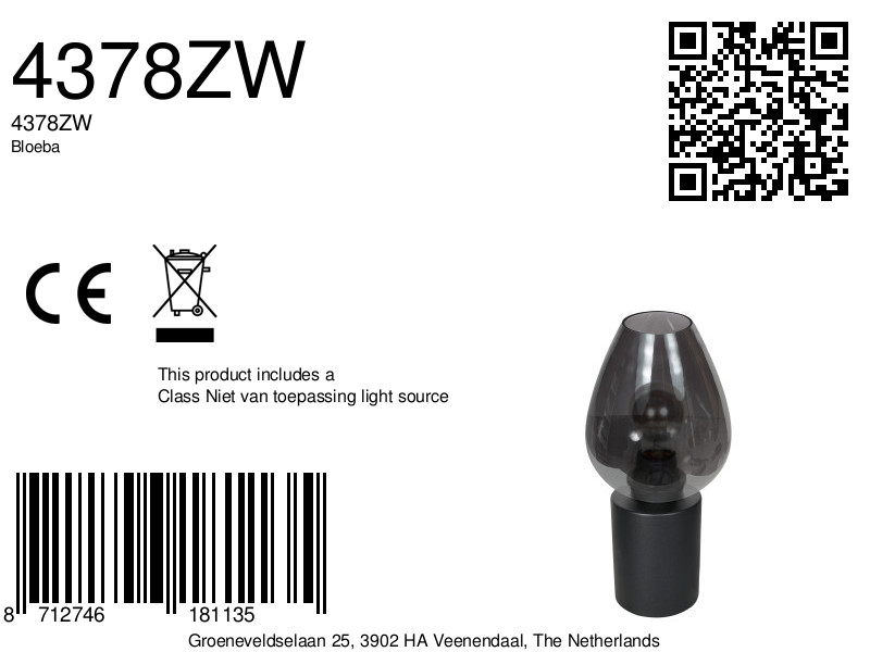 La Bloeba 4378ZW est une lampe de table compacte avec un abat-jour en verre fumé, en forme de goutte subtile mesurant 15 cm de large sur 11,7 cm de haut. Le verre est soufflé à la main et diffuse la lumière de manière chaleureuse, créant une ambiance conviviale.