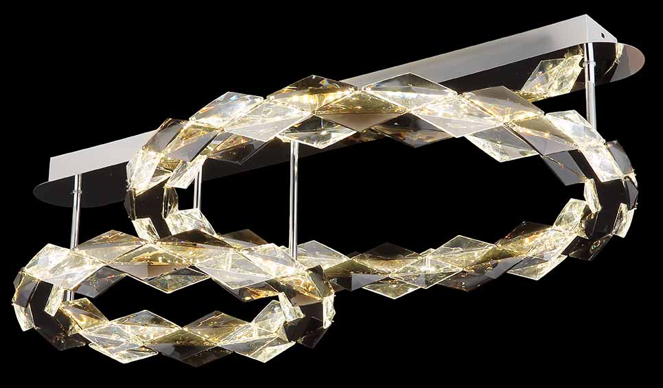 Cette magnifique et moderne lampe de plafond est fabriquée en métal chromé brillant et possède de subtils accents en acrylique de couleur fumée. Cet éclairage élégant contient également une ampoule LED de 50W écoénergétique avec une tension de 230V, qui diffuse une lumière agréable et chaude avec une température de couleur de 4000K dans toute la pièce. Grâce à une disposition unique de deux anneaux de diamètres de 55 et 37 cm, cette pièce maîtresse assure un éclairage uniforme et élégant. Cette lampe, mesurant 800 mm de long, 550 mm de large et 240 mm de hauteur, est parfaite pour les pièces avec des plafonds plus hauts ou pour servir de point central dans une chambre.