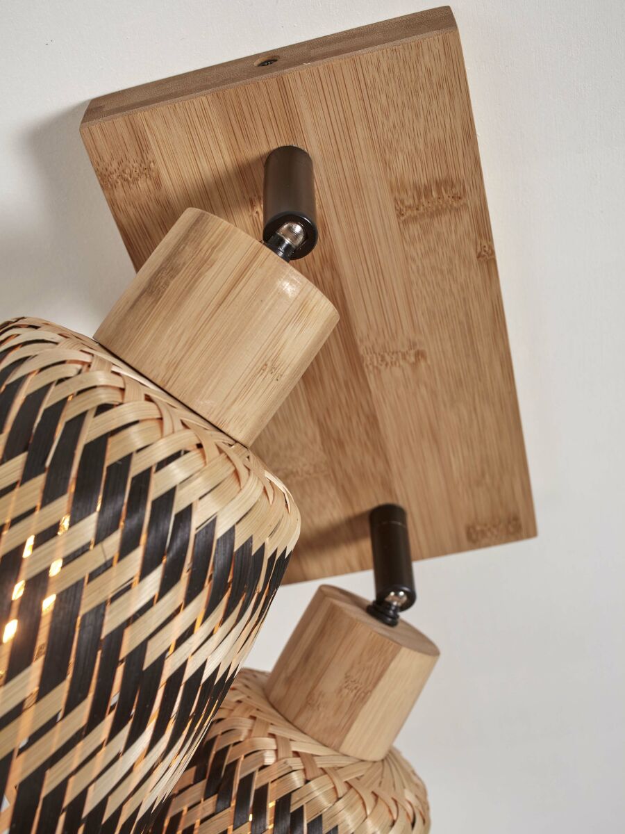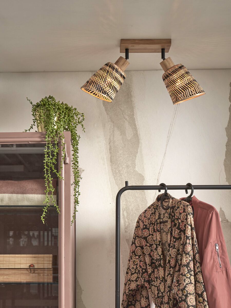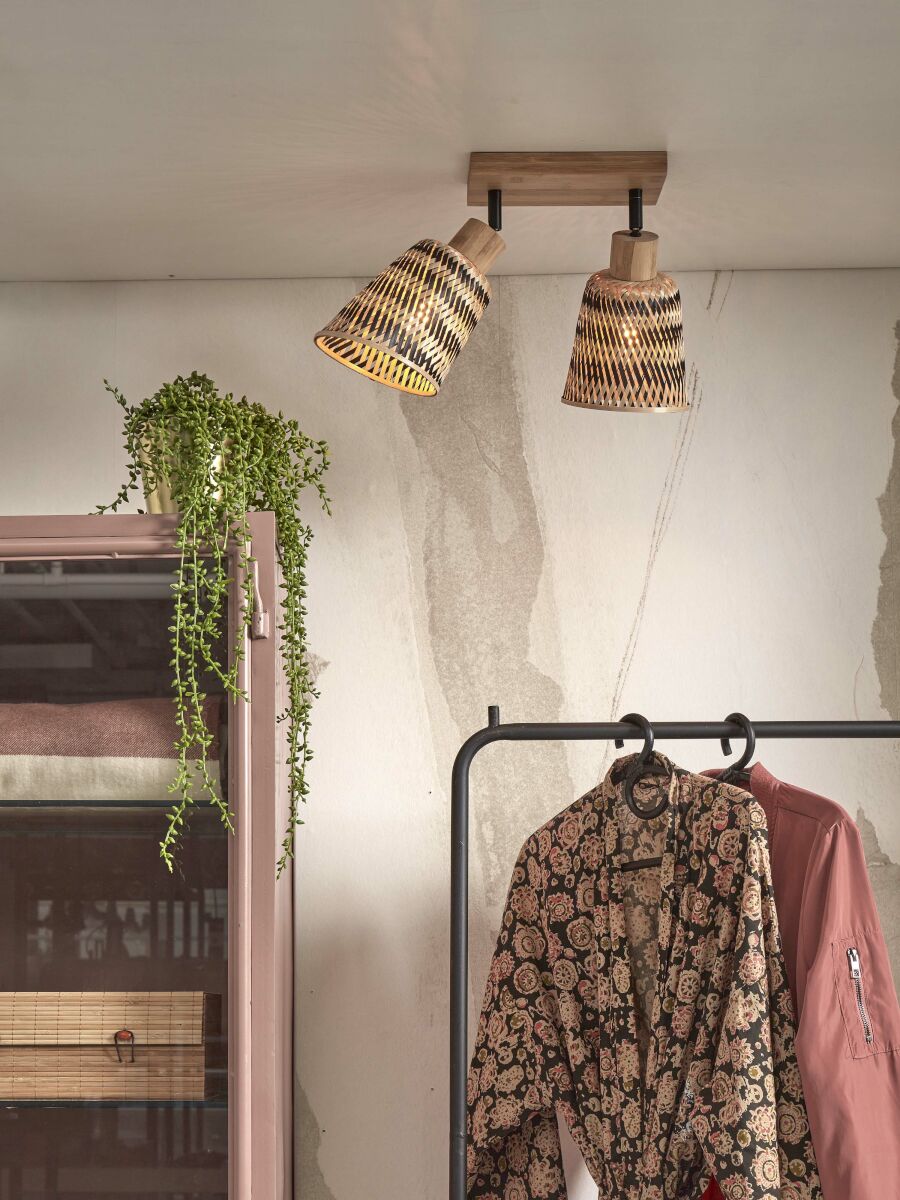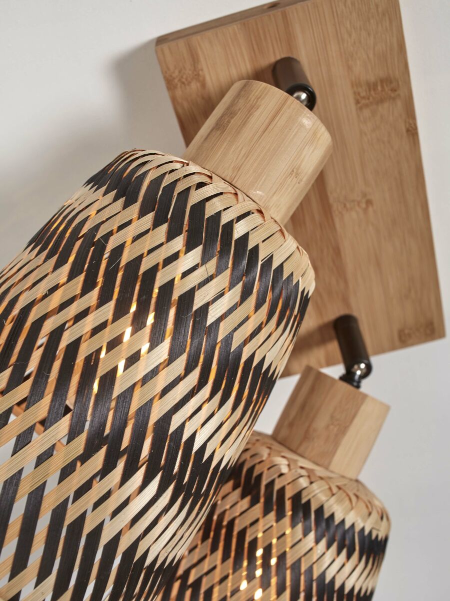 Plafonnier en bambou naturel dans un style bohème, idéal pour la salle à manger, le hall, le bureau (à domicile), la cuisine, la chambre ou le salon. Équipé de deux grands supports E27 et résistant à la poussière (IP20). Ajoutez une atmosphère exotique et chaleureuse à votre intérieur. La combinaison de bambou naturel et noir crée une apparence élégante et rustique qui enrichit chaque espace.