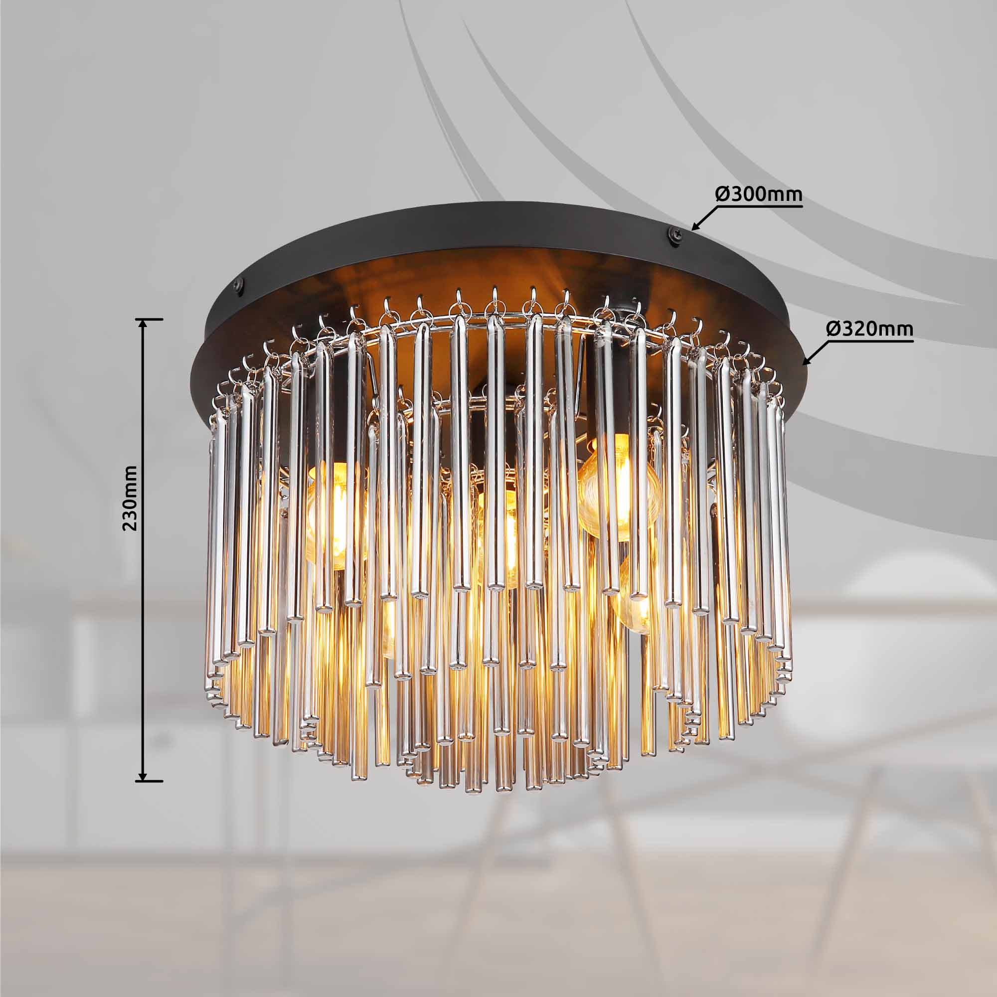 Découvrez l’élégante lampe de plafond GORLEY ! Le design impressionne par la combinaison de métal noir mat, de chrome brillant et de tiges en verre fumé. Cette combinaison unique ajoute une touche de raffinement et de style à votre espace. Avec un diamètre de 320 mm et une hauteur de 230 mm, la GORLEY s’intègre parfaitement dans différents espaces. Grâce aux douilles E14, vous pouvez déterminer vous-même la couleur et la luminosité de la lumière jusqu’à une puissance maximale de 40 watts. Laissez libre cours à votre imagination et choisissez les ampoules appropriées pour créer l’ambiance souhaitée. Apportez un design unique et une lumière agréable chez vous avec la lampe de plafond GORLEY !