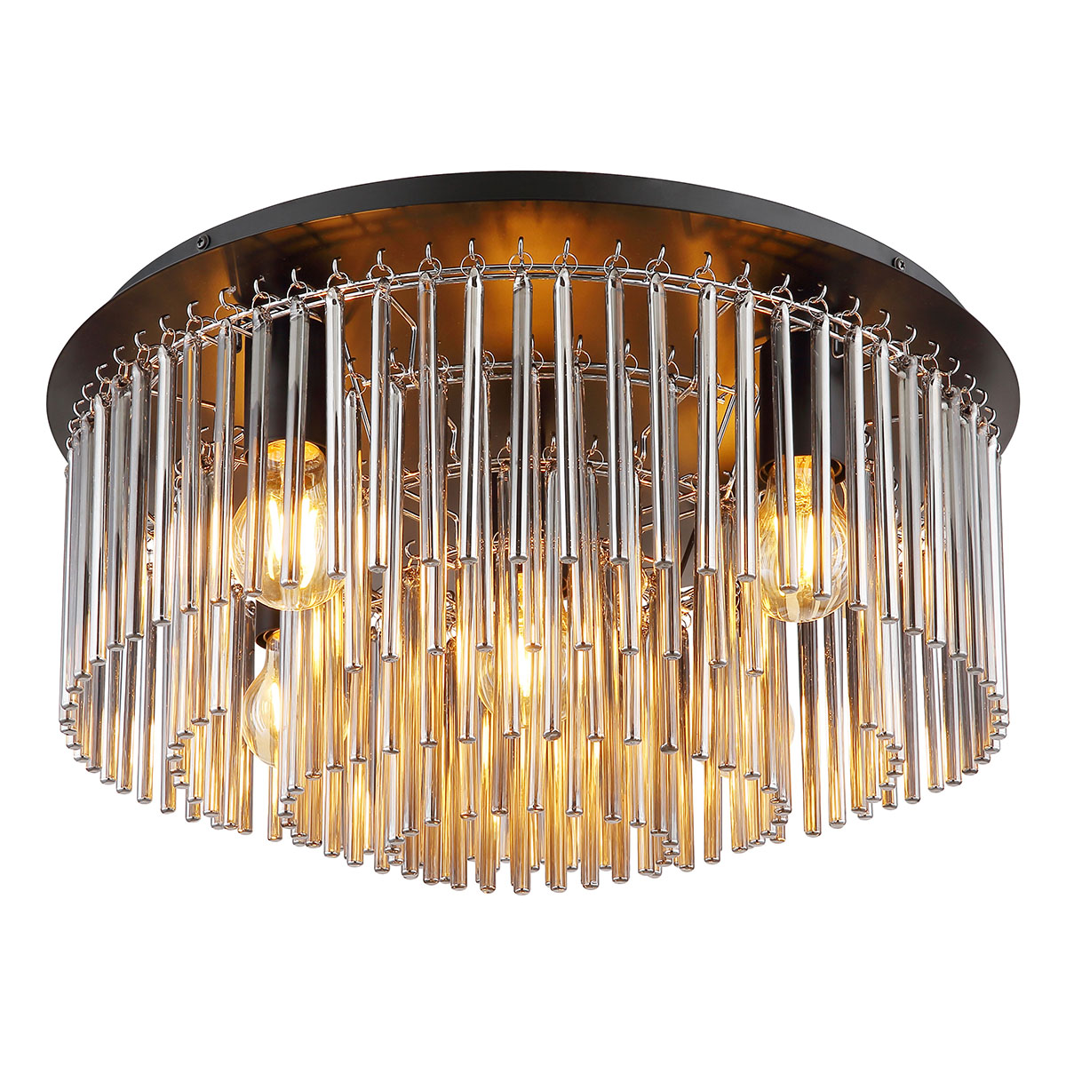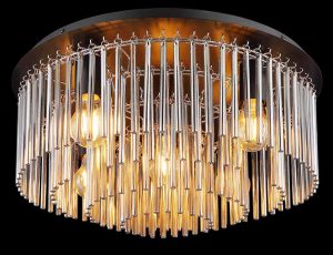 Le plafonnier est fabriqué en métal noir mat et en tiges de verre fumé disposées dans un diamètre de 500 mm. Le luminaire nécessite 5 ampoules E27, chacune avec une puissance allant jusqu’à 60 W et une tension de 230 V. Ce plafonnier est un véritable point focal et est idéal pour les espaces de vie modernes. La combinaison de métal noir mat et de tiges de verre fumé donne à la lampe une allure élégante. Le plafonnier a un diamètre de 500 mm et une hauteur de 250 mm. Il est idéal pour les pièces avec de hauts plafonds ou comme élément central dans une pièce.
