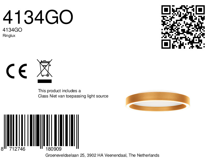 Le Ringlux 4134GO est un élégant plafonnier avec une finition dorée luxueuse et un diamètre de 30 cm. Sa forme ronde et sa couleur chaude donnent à la lampe une allure chic qui s’intègre bien dans les intérieurs modernes et classiques. À l’intérieur se trouve un anneau LED de 20 watts qui fournit environ 2000 lumens de lumière directe, complété par un anneau LED de 5 watts qui éclaire doucement le plafond pour un effet spatial supplémentaire.