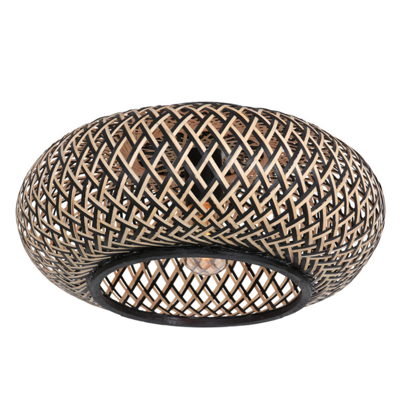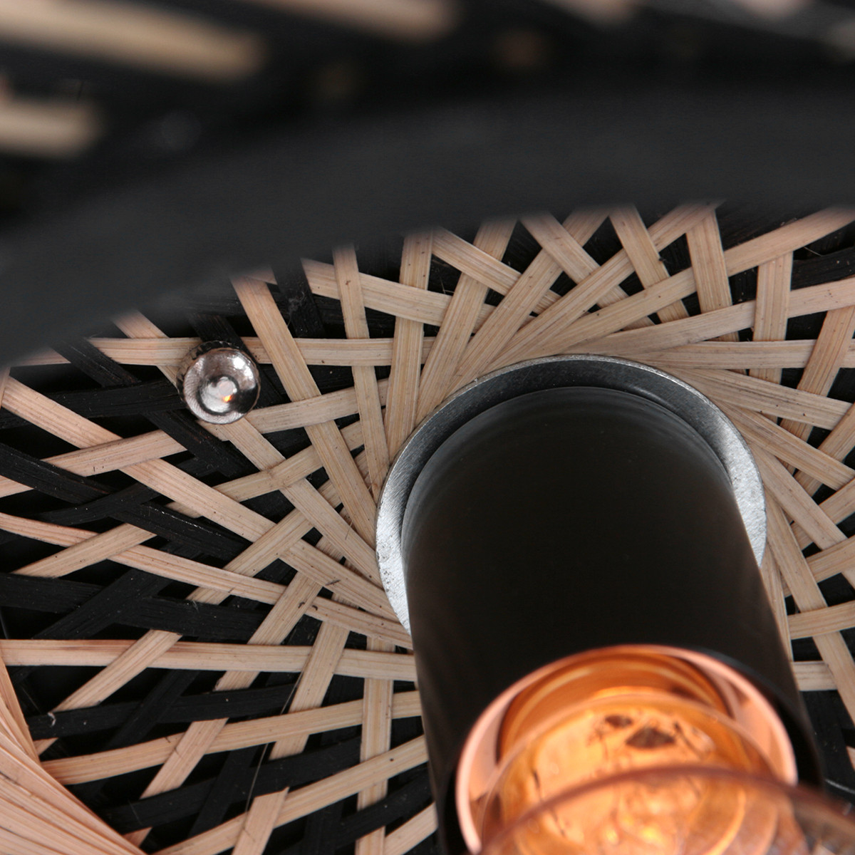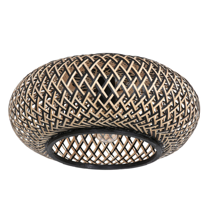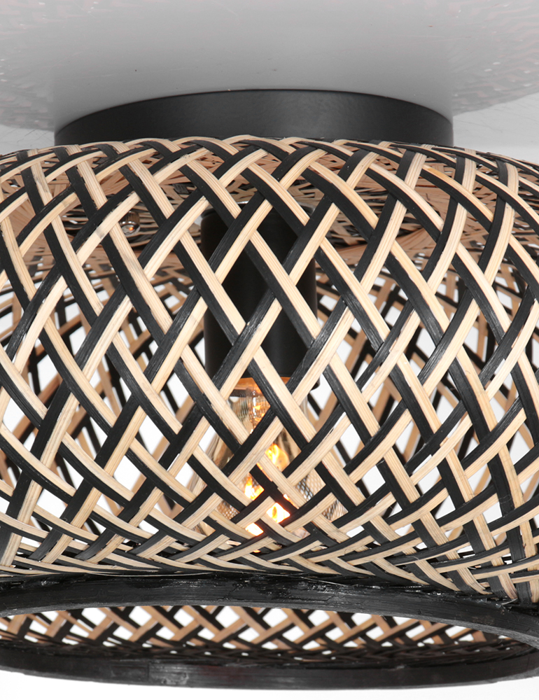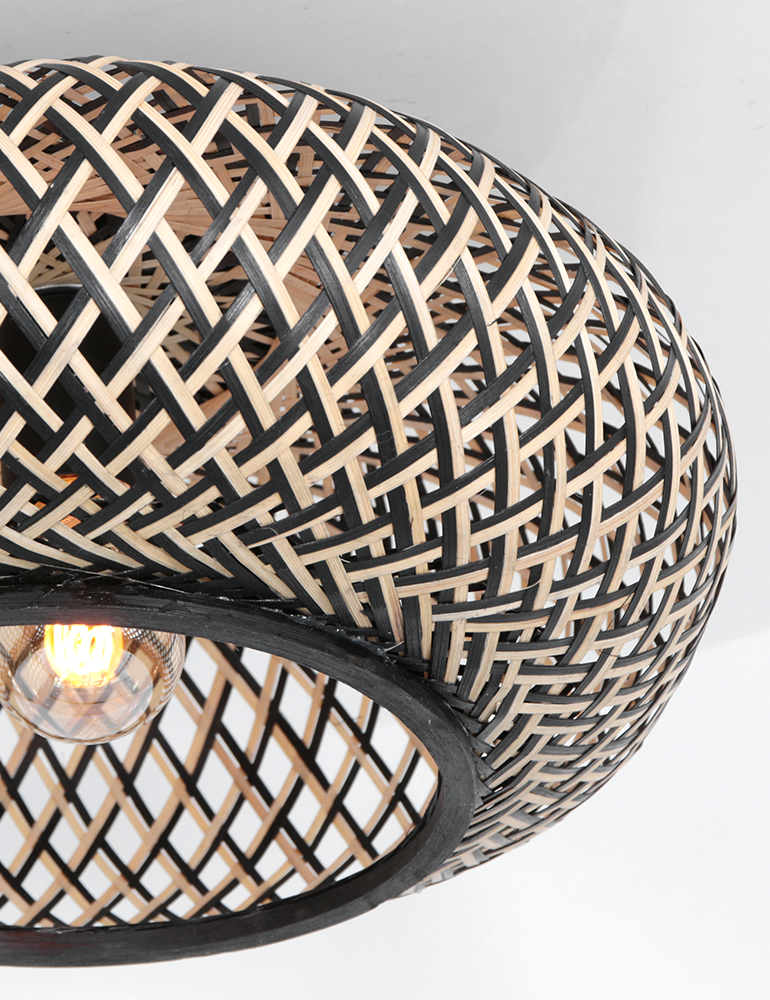 La lampe de plafond en bambou tressé ajoute une atmosphère supplémentaire lorsqu’elle est allumée. La lumière passe à travers les trous du tressage. La couleur de la lampe elle-même, une combinaison de bambou brun et de noir, crée un effet supplémentaire. Cette lampe s’intègre dans un intérieur classique, mais convient également à une décoration moderne.