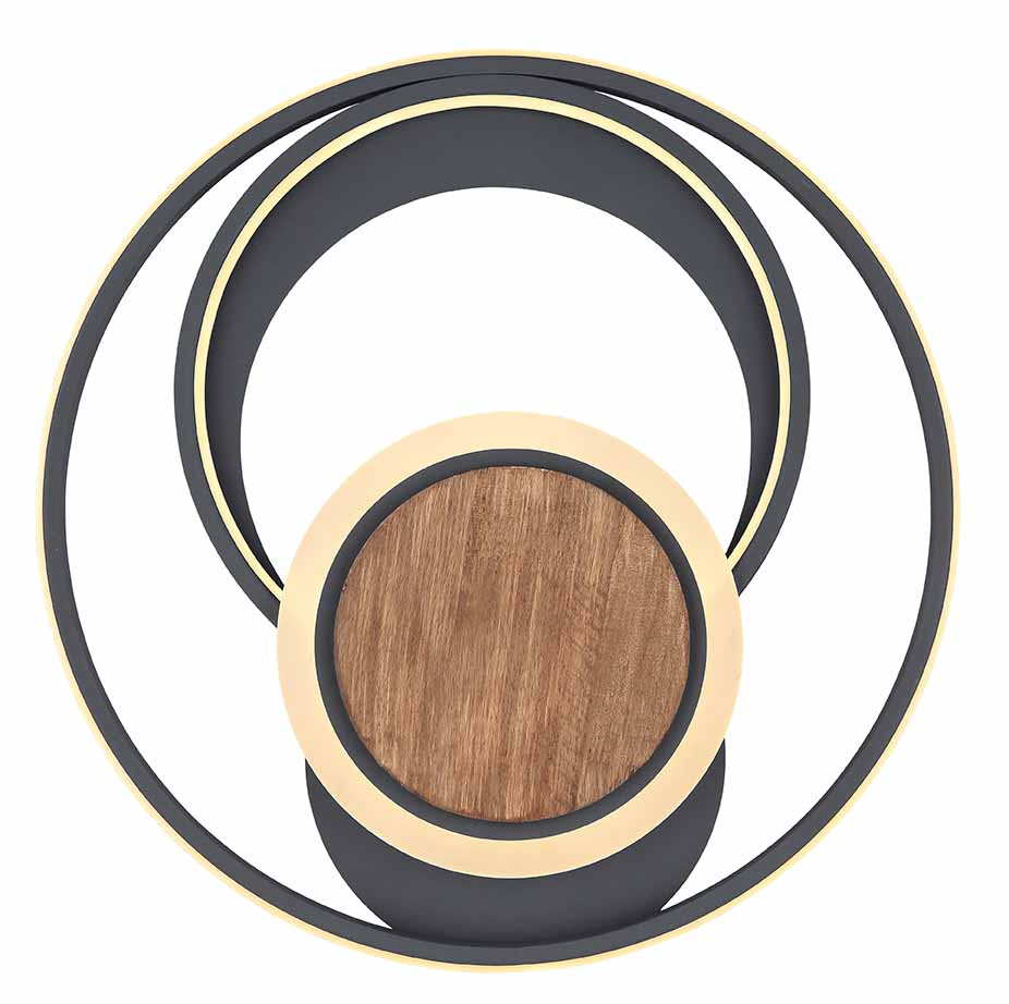 Notre collection Nirra vous propose ce magnifique plafonnier rond (ø 49,5 cm) qui s’intègre parfaitement dans chaque pièce de votre maison. Le design unique de trois solides anneaux métalliques de couleur graphite, élégamment enroulés autour d’un panneau central en bois brun foncé, confère une valeur esthétique riche. L’acrylate opale dissimule non seulement les lampes LED intégrées mais offre également une lumière douce et puissante de 1500 lumens avec une teinte blanc chaud de 3000 Kelvin. Élargissez votre décoration avec d’autres articles de la série Nirra pour une ambiance entièrement coordonnée et stylée.