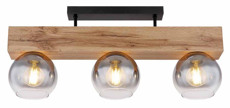 Ce magnifique plafonnier de la série MOITAS s’inspire d’un design exceptionnel. Deux courtes tiges métalliques s’étendent d’un support de plafond rectangulaire noir vers un bloc en imitation bois (65x15cm). Il y a trois douilles E27, chacune avec un abat-jour en verre dans des teintes fumées. Avec les connexions E27, vous pouvez choisir la couleur de la lumière et la luminosité jusqu’à une puissance maximale de 40 watts.