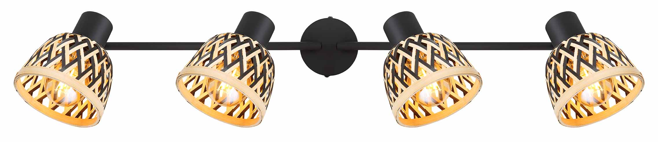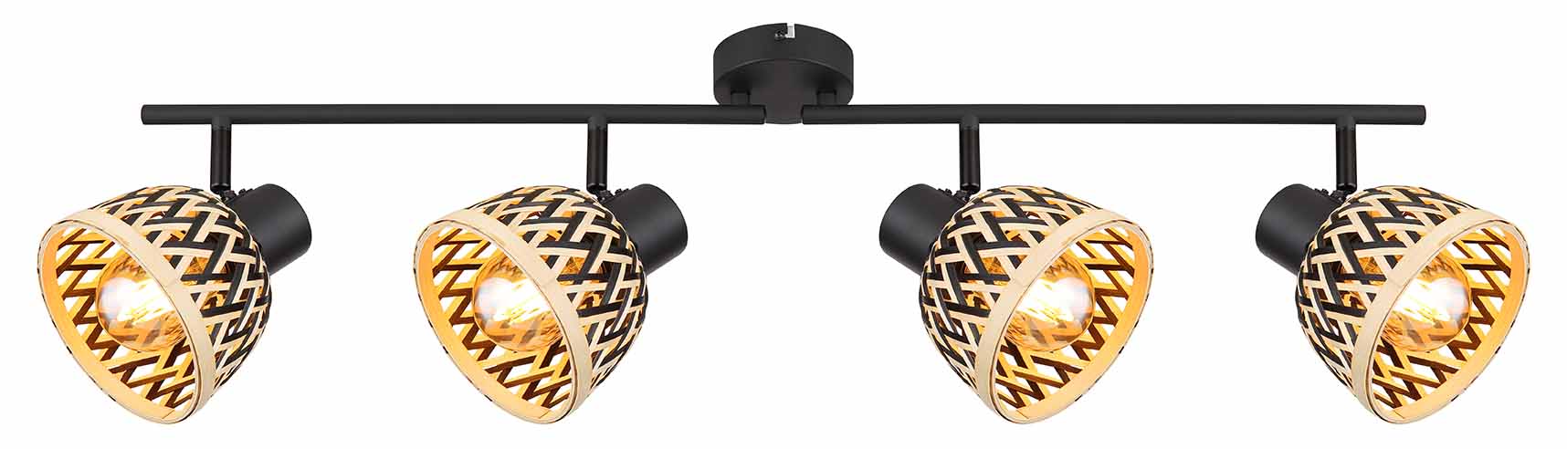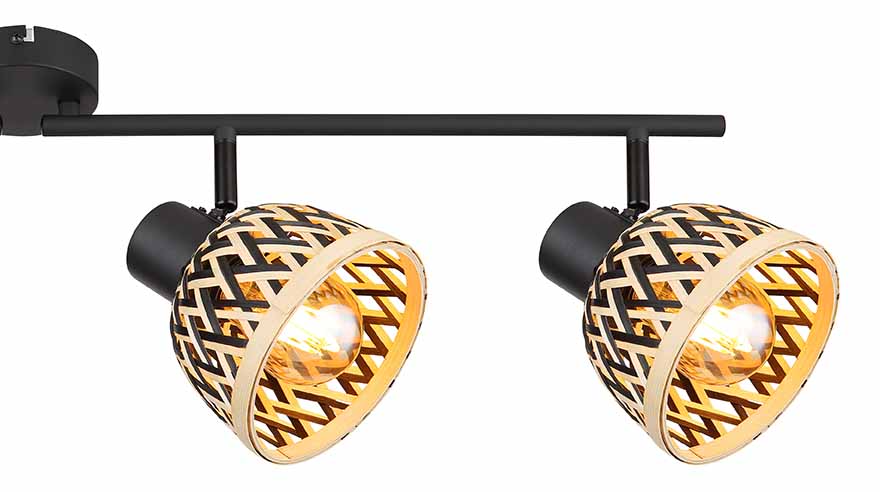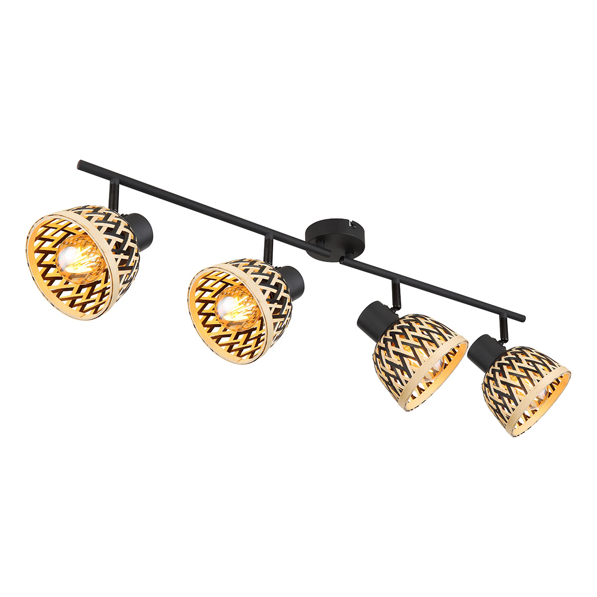 Ce projecteur élégant de la série COLLY combine le bambou et le métal pour un look unique. Le support de plafond rond porte une tige en métal de 80 cm avec quatre têtes de lampe réglables, chacune avec un couvercle en bambou. Les douilles E27 supportent des ampoules jusqu’à 15 watts, vous permettant de régler la luminosité et la couleur de la lumière selon vos souhaits. Cette lampe apporte une ambiance chaleureuse et naturelle dans chaque pièce.