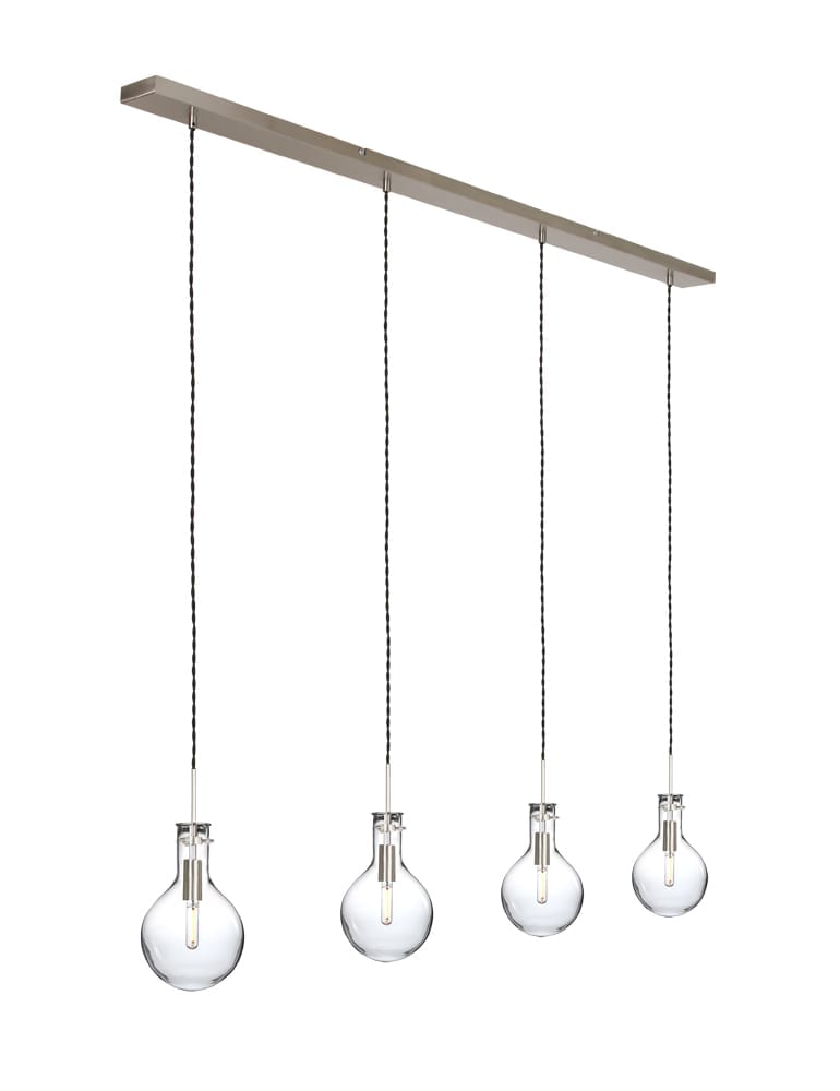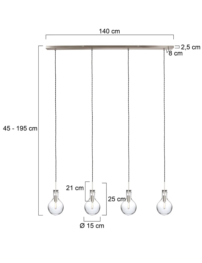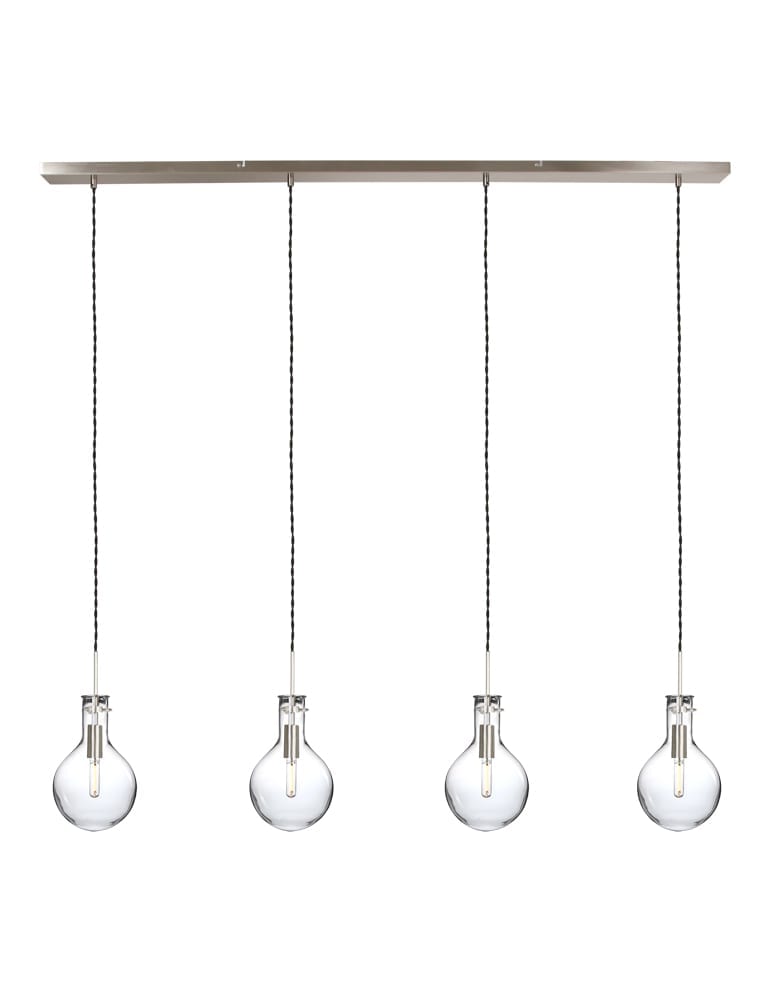 Pourquoi accrocher une grande suspension au-dessus de votre table à manger ? Nous trouvons cette suspension à 4 lumières en verre de Steinhauer comme une très belle alternative ! Cette suspension a un large plafond en acier brossé. Quatre lampes en verre y sont suspendues, qui de loin ressemblent à de grandes ampoules. Il n’y a cependant pas de filament, mais une douille avec l’ampoule correspondante. Cette suspension est si large qu’elle est parfaite pour une table à manger un peu plus grande, ou donnez-lui un emplacement original au-dessus de votre buffet !