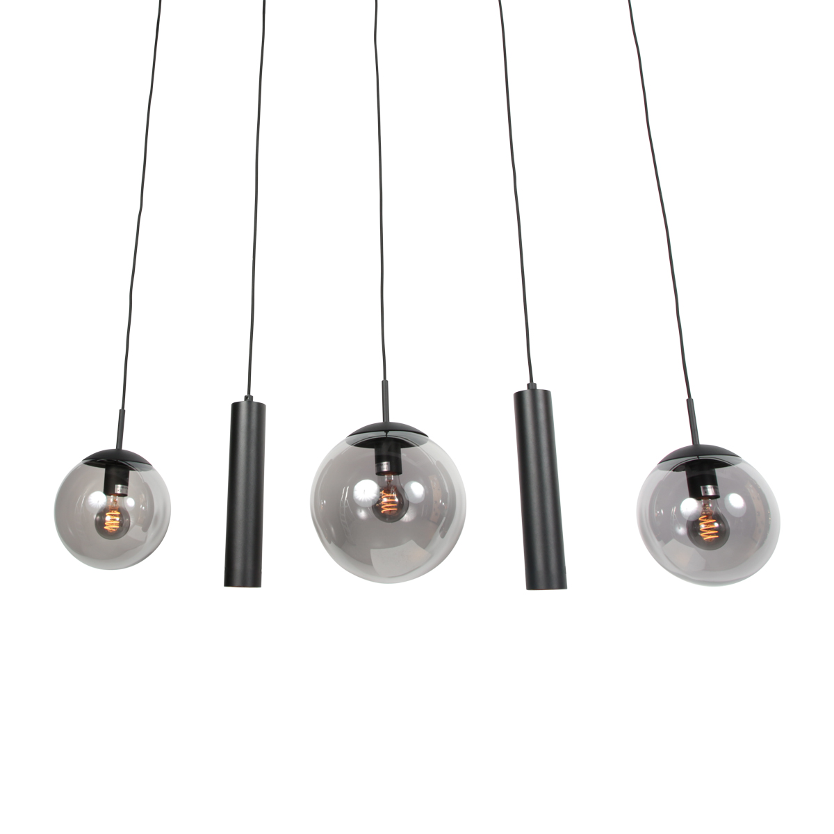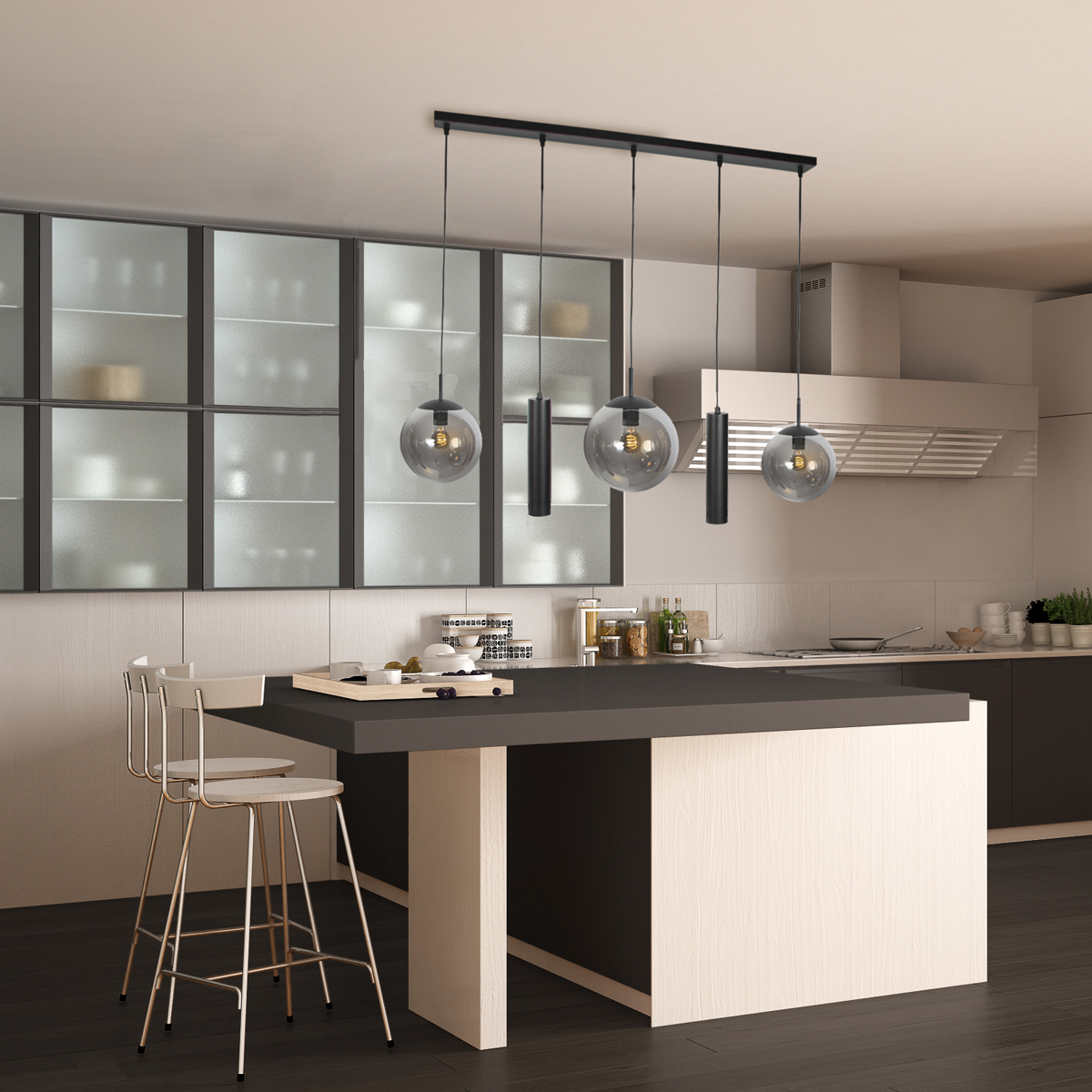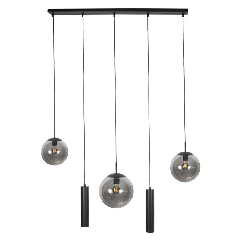 Cette lampe suspendue allongée allie un design épuré à un éclairage chaleureux et est idéale au-dessus d’une table à manger ou d’un îlot de cuisine. La combinaison de trois globes en verre fumé et de deux tubes lumineux noirs élancés crée un ensemble ludique mais apaisant. Les globes en verre fumé diffusent une lumière chaude et diffuse, tandis que les tubes fournissent une lumière ciblée sur la surface en dessous.