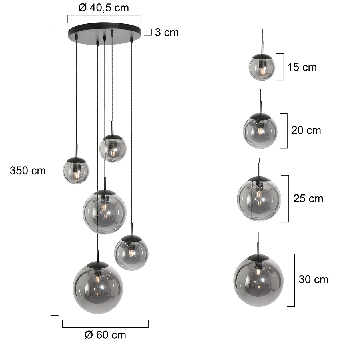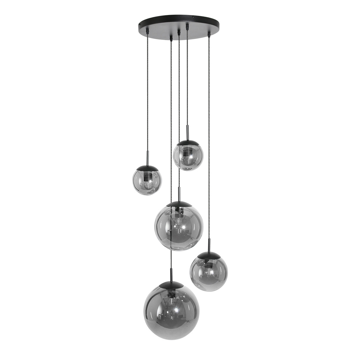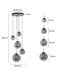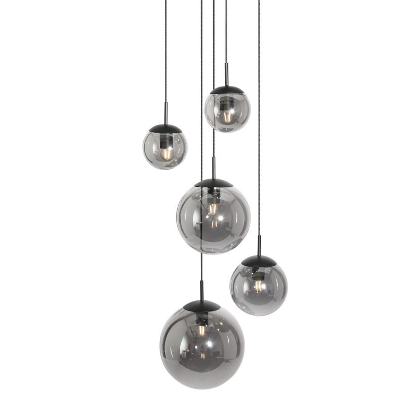Le luminaire Bollique combine cinq boules de lumière en verre fumé de tailles variées pour créer un tout stylé. La finition réfléchissante permet un jeu subtil de réflexion et de diffusion de la lumière. Avec une longueur maximale de 350 cm, ce luminaire est idéal pour les plafonds standards ainsi que pour les grands vides. Le plat de plafond a un diamètre de 40,5 cm, assurant une suspension équilibrée. Chaque boule de lumière est équipée d’une douille E27 et est compatible avec des sources lumineuses allant jusqu’à 40 Watts. Les câbles noirs renforcent le caractère contemporain du luminaire.