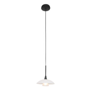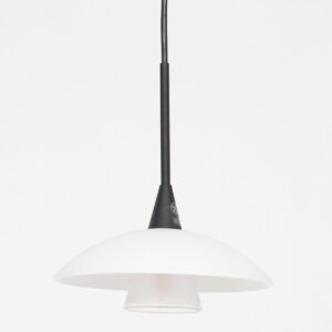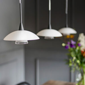 Une transformation pour votre salon ? Remplacez tous vos éclairages par des lampes de la même série attrayante ! Steinhauer a pour vous la série “Tallerken”. La lampe illustrée ici est la suspension simple. Suspendue par son cordon, qui a un manchon en métal noir au-dessus de l’abat-jour, une soucoupe en verre opalin est accrochée à l’envers. La source LED est suspendue en dessous. Combinez-la avec les appliques murales “Tallerken”, les lampadaires et les suspensions à trois lumières !