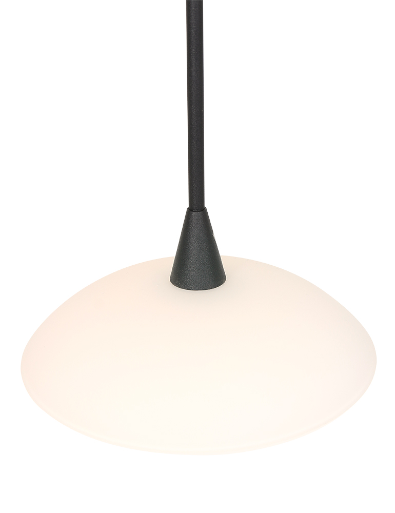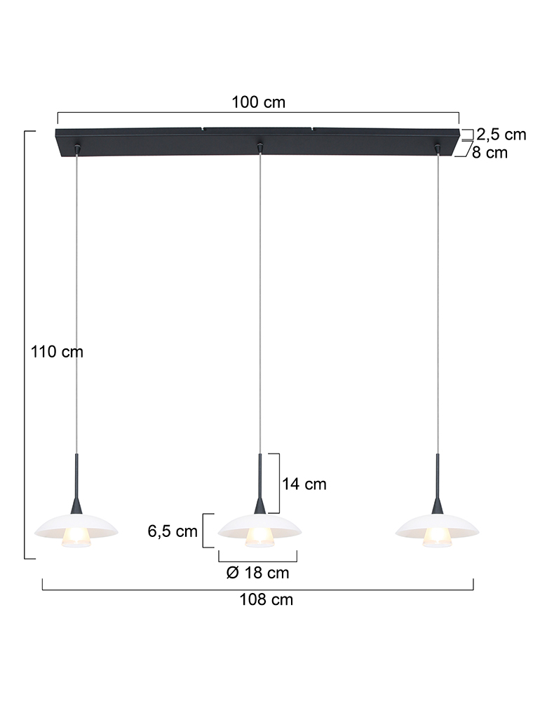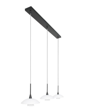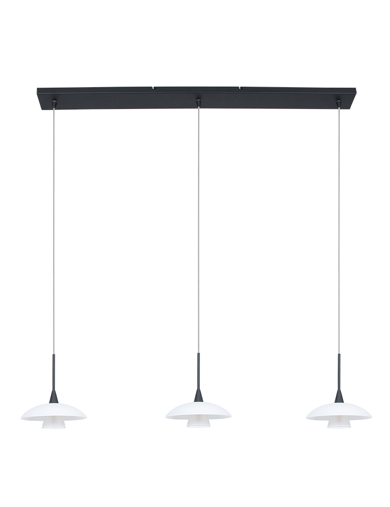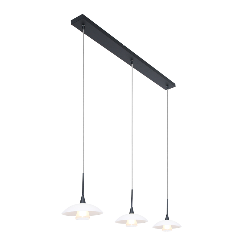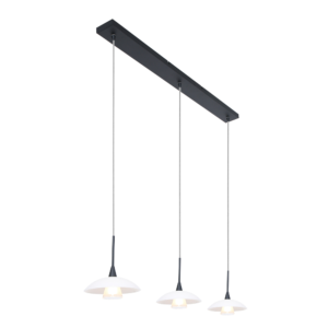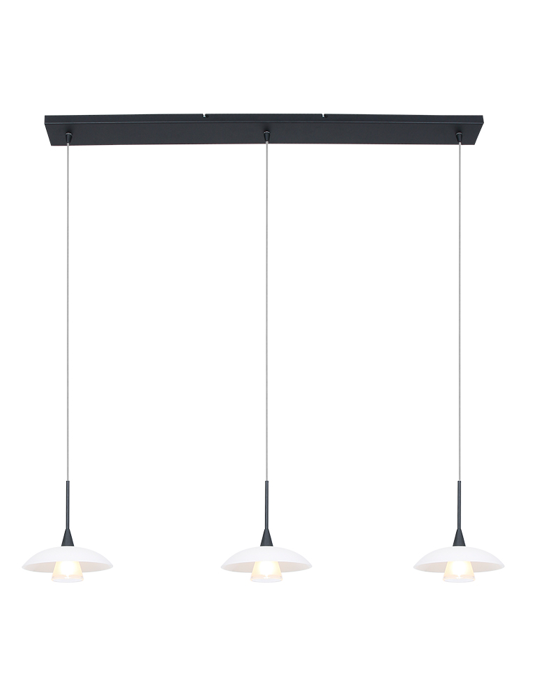 La suspension à trois lumières de la série Tallerken dispose de trois assiettes en verre blanches et d’une plaque de plafond rectangulaire noire et épurée. Chaque point lumineux est équipé d’un support G9 et la lampe est fournie avec trois sources lumineuses LED de 5 Watts chacune, offrant une luminosité de 500 lumens et une température de couleur de 2700 Kelvin. La lampe est dimmable avec un variateur externe (non inclus) et réglable en hauteur jusqu’à un maximum de 110 cm.