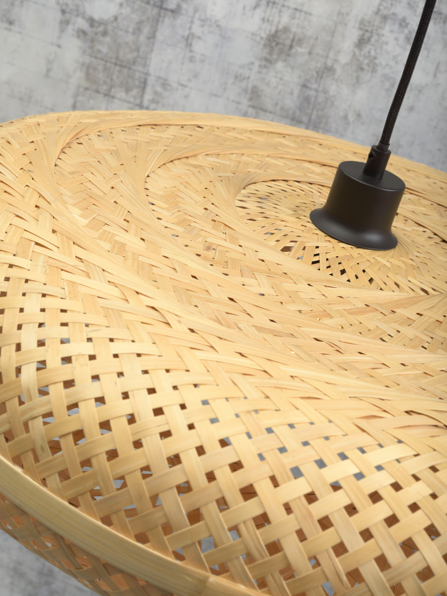 Suspension en bambou ronde bohemian, GOOD&MOJO Palawan. Idéale pour la salle à manger, le hall, la chambre ou le salon. Équipée d’un support E27 et résistante à la poussière (IP20). Source de lumière non incluse. Créez une ambiance détendue et profitez de la beauté naturelle de cette lampe unique.