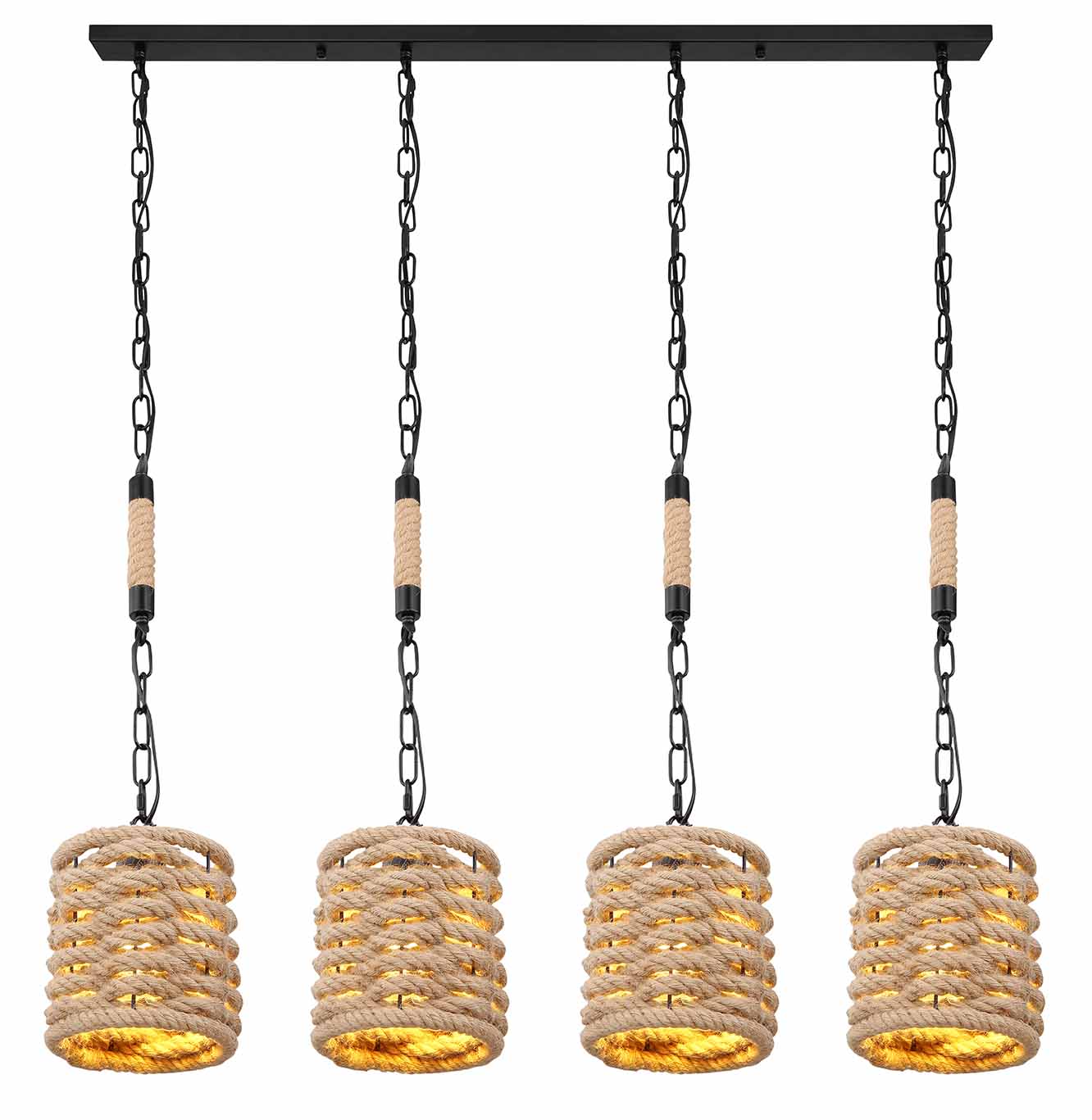 Cette incroyable suspension se distingue surtout par sa combinaison de matériaux en métal noir mat et en corde de chanvre, et est absolument le centre de vos pièces. Sur un rail d’une longueur de 107 cm, quatre chaînes descendent vers les belles abat-jours en corde de chanvre qui sont équipés d’un raccord E27, vous permettant ainsi de choisir individuellement la luminosité et la couleur de la lumière jusqu’à une puissance maximale de 40 watts.