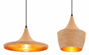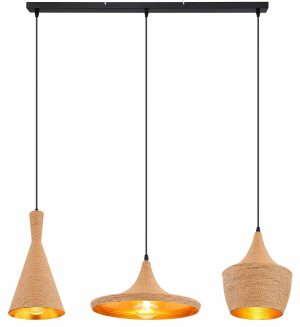 Cette suspension de la série Ludmilla est idéale pour votre salon ou votre salle à manger. La suspension de 107 cm de long se compose de trois abat-jours en aluminium doré de différentes formes, recouverts à l’extérieur de textile brun. Ceux-ci peuvent être équipés d’ampoules E27 de votre choix, vous permettant de déterminer individuellement la couleur et la luminosité de la lumière. De plus, la hauteur de la suspension peut être ajustée jusqu’à 140 cm lors de l’installation. Avec d’autres modèles de la même série, vous pouvez rehausser le style de votre intérieur.