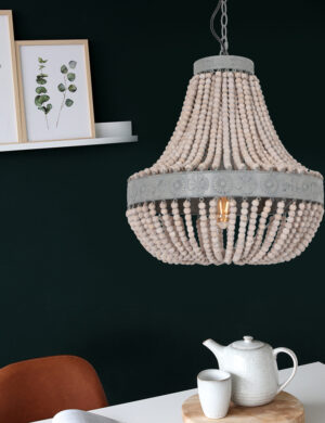 Cette suspension chambre parentale révèle de nombreux détails : les perles, les décorations sur le métal ou la chaîne brute la rendent fascinante et créent un ensemble attrayant. La lampe Luna laisse la lumière briller dans la pièce grâce aux ouvertures entre les perles. Avec sa finition blanchie à la chaux, cette lampe trouvera sa place dans tous styles d’intérieur : ambiance scandinave, vintage ou simplement rurale !