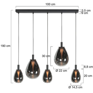 Vous cherchez un véritable accroche-regard pour au-dessus de votre table à manger ou de votre îlot de cuisson ? Ce lustre à 5 lumières en noir avec verre fumé élève votre intérieur à un niveau supérieur. Grâce à la hauteur réglable de chaque verre (30-170 cm), vous pouvez adapter l’agencement complètement à votre espace. La combinaison de verre fumé et de la structure noire confère à la lampe une allure luxueuse et moderne. Les cylindres blancs dans le verre assurent une douce lumière ciblée – idéale pour des soirées conviviales ou un dîner en toute ambiance.