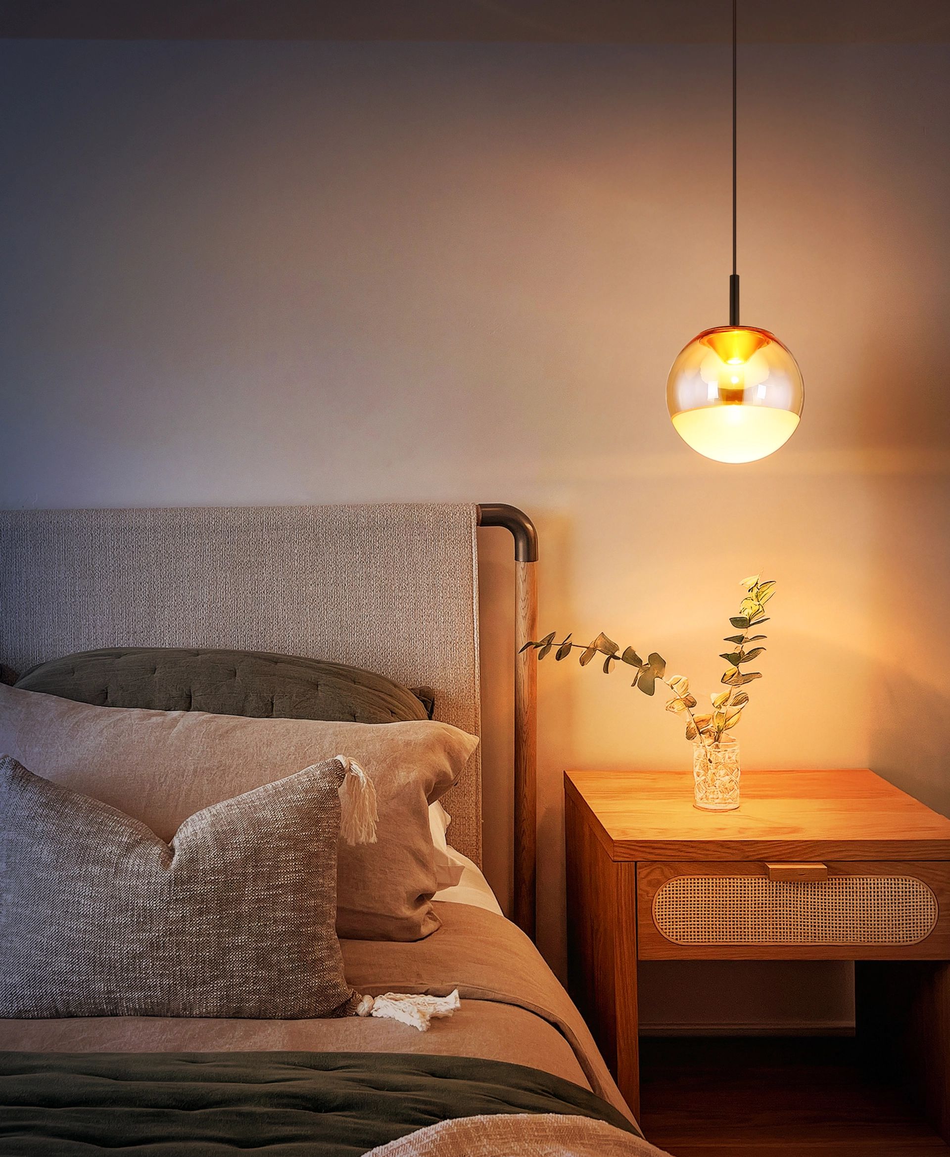 La suspension SEVERIN ajoute une touche d’élégance et de modernité à votre intérieur. Avec sa boule en verre et sa finition ambre satinée associée à un cadre en métal noir mat, cette lampe offre une allure élégante. L’abat-jour en aluminium couleur laiton accentue le design chic et s’harmonise parfaitement avec la lumière douce de la technologie LED intégrée. Avec un diamètre de 250 mm, cette lampe est particulièrement adaptée aux petits espaces ou comme éclairage d’accent chaleureux au-dessus des tables à manger, des îlots de cuisine ou dans les couloirs.